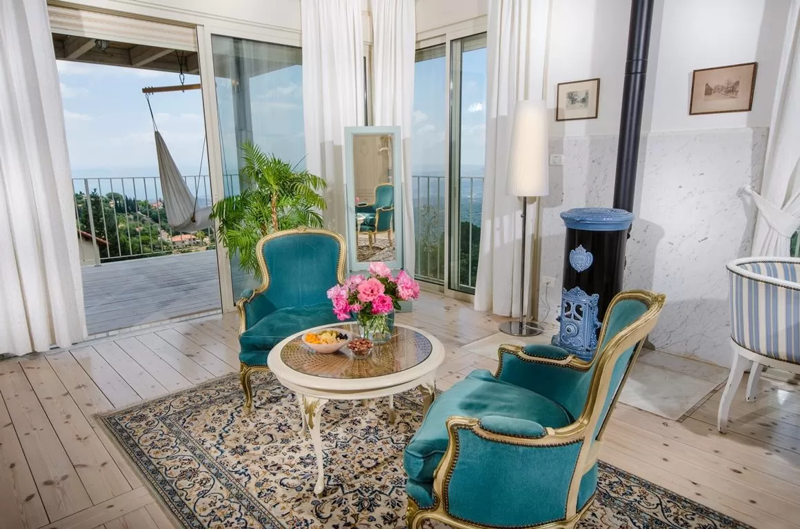 Each suite here has a wide balcony overlooking the view, a GODIN fireplace (in a model that has not changed for 500 years), a large jacuzzi, and more. The ceilings here are exceptionally high. As I walk from suite to suite, stopping by rare items that caught my eye, Bella, the hostess, tells me about the history of the ancient mirror in the gilded frame, the impressive light fixture that hangs from the ceiling, the exotic carpet from ancient times – every object here has a fascinating past, character, and story.