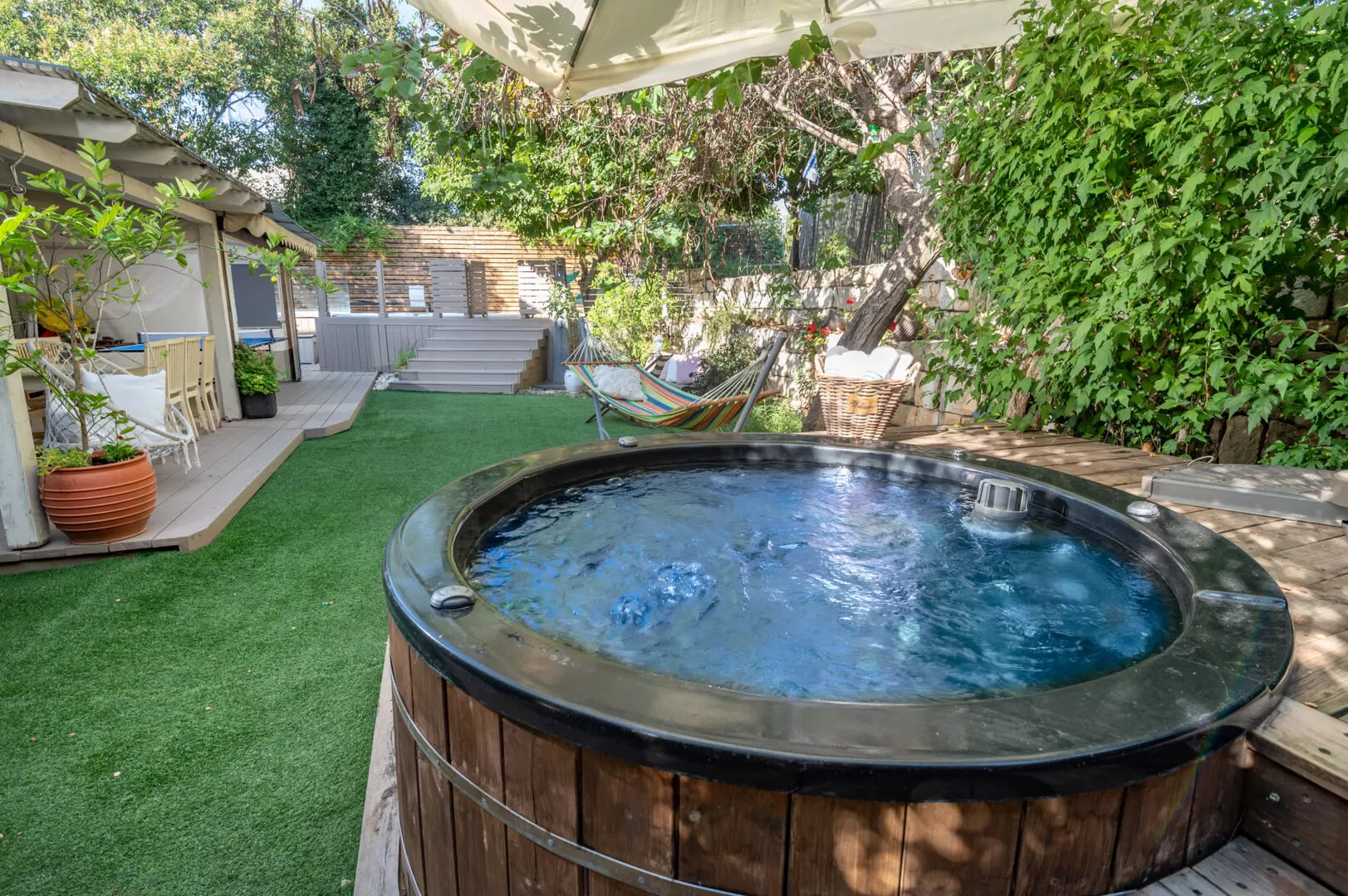 The house's outdoor area is spacious and offers a variety of treats for every season - the complex includes a spa complex with a combined pool and a spa jacuzzi (a hit) - both covered for the winter. In addition, there is a balcony with a hammock, a barbecue area and a swing, and further on a lawn and a pampering round hot tub, and a dry sauna. You will find more hammocks, a ping pong table and a dining table. The entire spa complex is located next to orchards so the feeling is private and quiet.