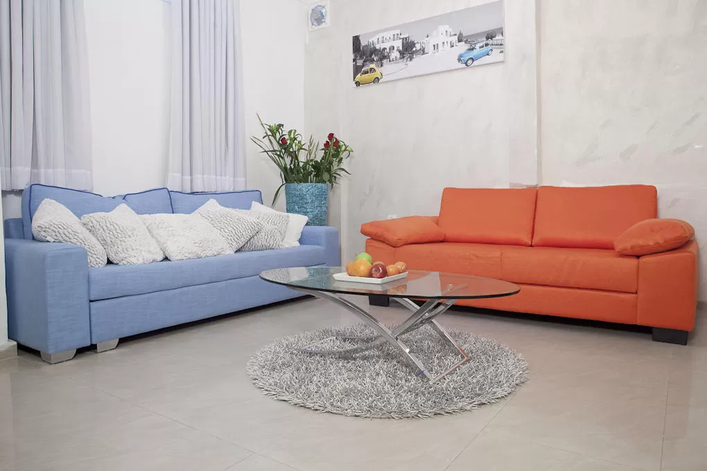 The suite is divided into two large rooms - the central space and the bedroom with the jacuzzi complex. The central area is a living room corner consisting of two colorful sofas (one of them, the blue one, opens to an additional double bed), a glass coffee table and a 42 inch TV connected to YES channels.