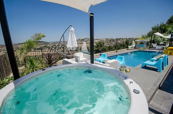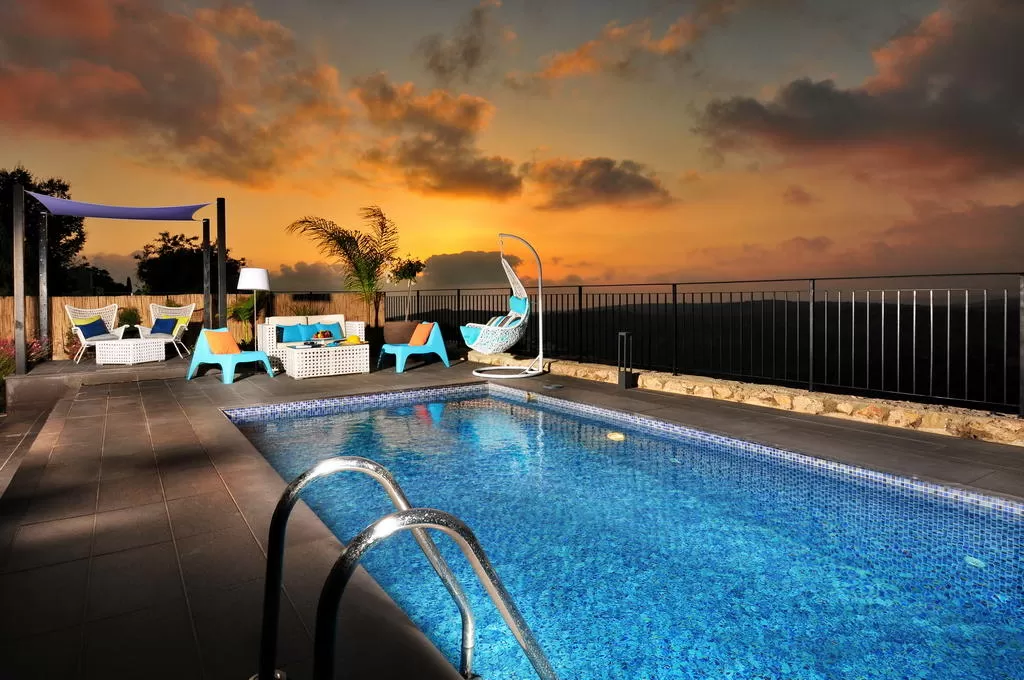 The two suites at Fivetis are located in a spacious building, with separate access and complete privacy. The suites are located below the host house, with partial privacy in the shared outdoor area but have an open view, a heated swimming pool, stylish outdoor furniture and two designed "canopy" sheds, with a dining table and romantic lighting.