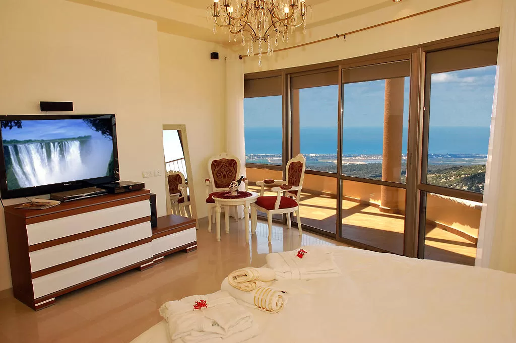Villa Sivan: the huge area of the suite is divided into a central space, which is here a living room, a kitchen and 5 decorated bedrooms. The structure of the central space is partly made of transparent walls, through which the spectacular views of the Galilee flow in. A large balcony, as if "hanging" in the air, that surrounds the outside of the space, provides optimal vantage points for the view spread to the far horizon, from the Galilee mountains to Rosh Hankara.
