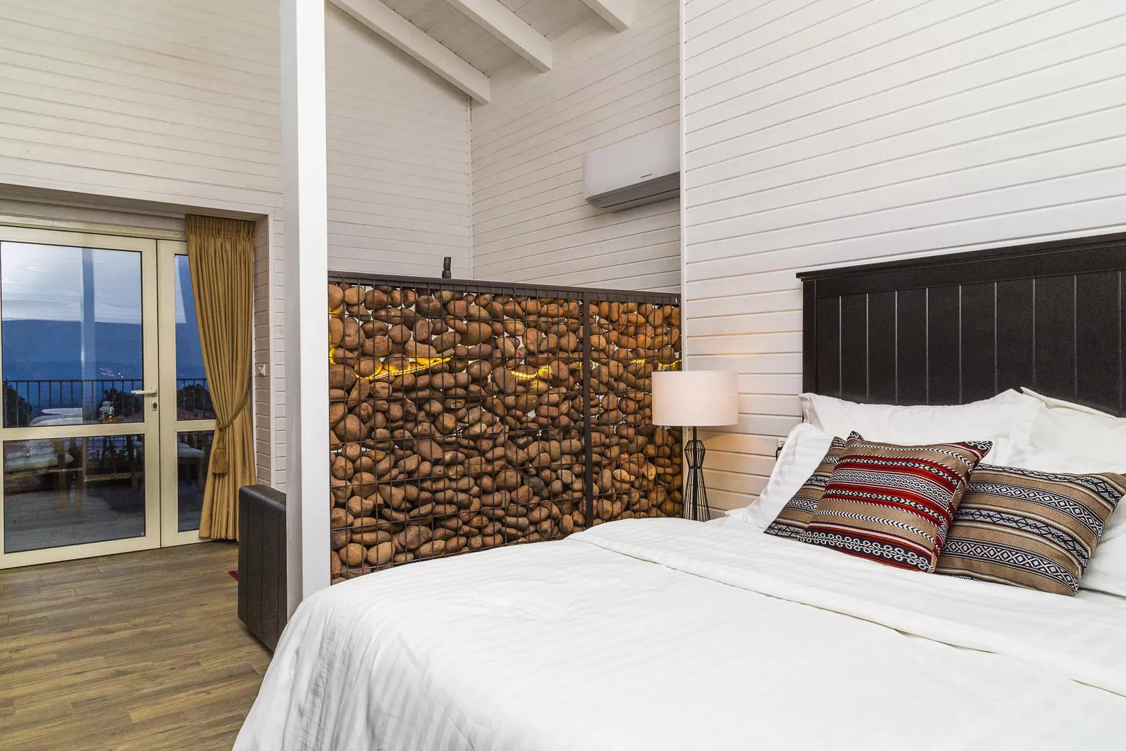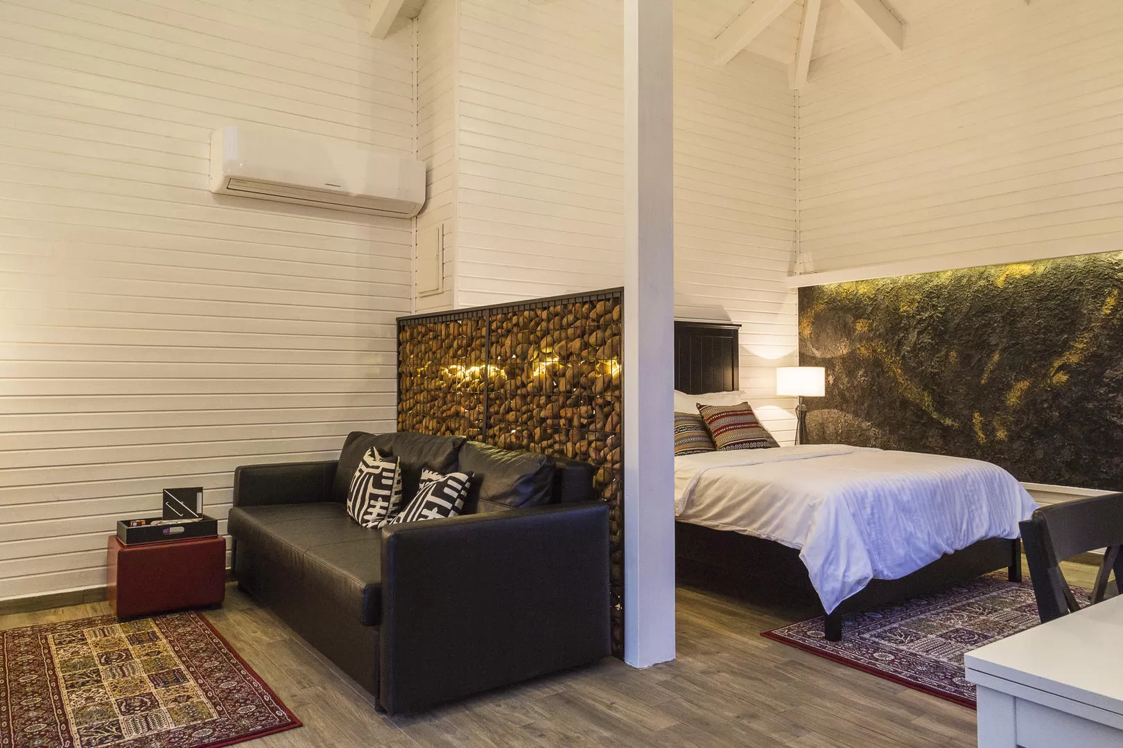 הפטיו הזה נפתח גם לחלל השינה ומהווה כיוון אויר חדש ומפתיע לסוויטה. הגישה אל הפטיו היא דרך נישת ישיבה לבנה שניצבת מול המיטה הזוגית. האבנים המיוחדות, הגינון המוקפד ופכפוך המים מבריכת הנוי החמודה הופכים את הפטיו למקום קלאסי לתפוס בו כמה דקות (או שעות) של שלווה אמתית.