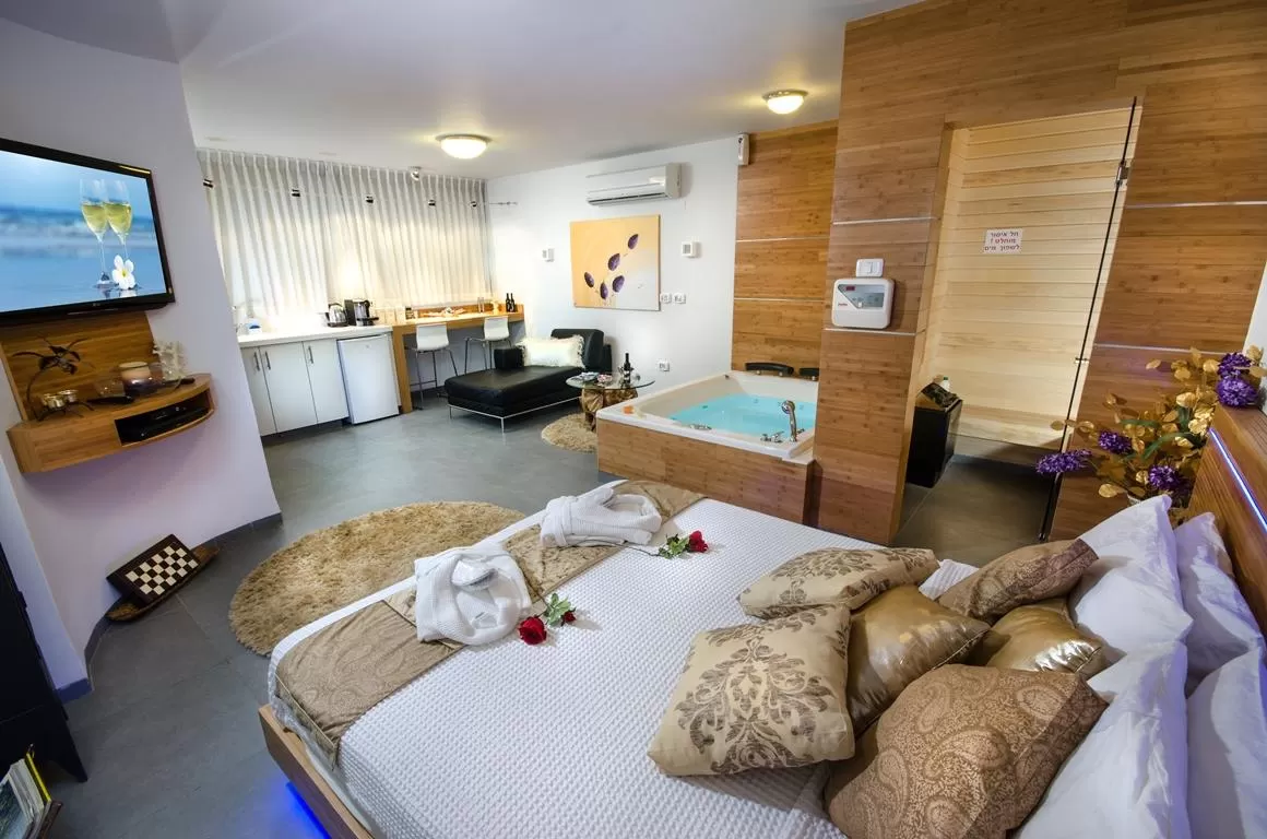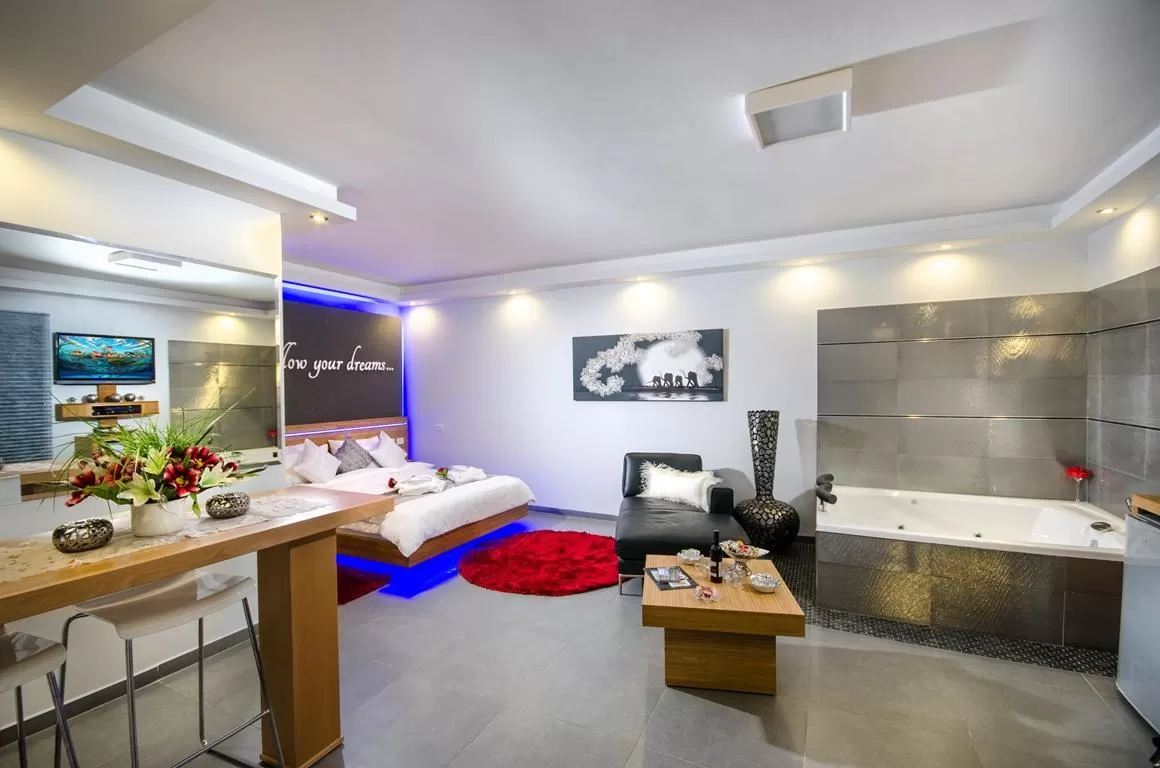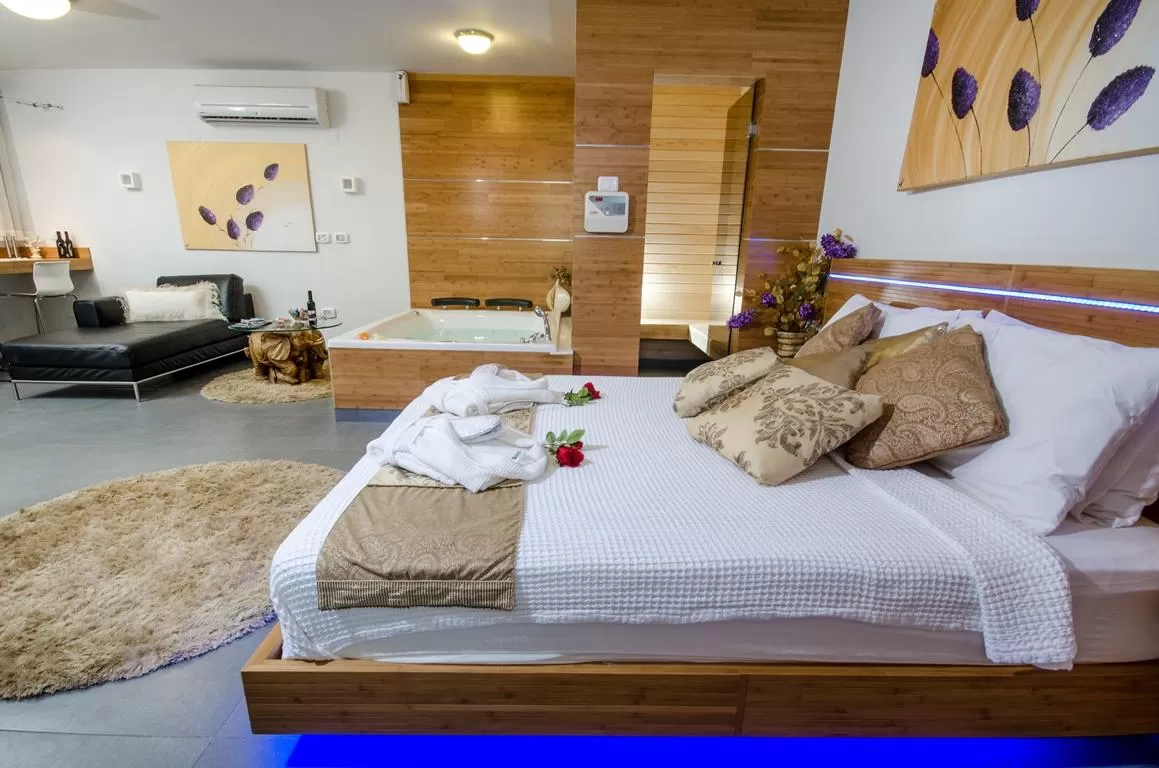 The suites consist of an open and "breathing" space with an extra large double bed. A private sauna and a large double jacuzzi complete what is needed for a romantic stay. Opposite the bed is a small kitchenette (you can't cook). The design is very luxurious and meticulous, and as mentioned the level of cleanliness and maintenance is particularly high.