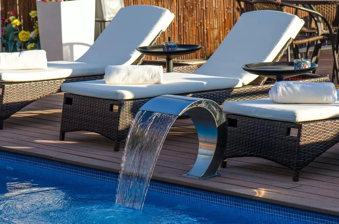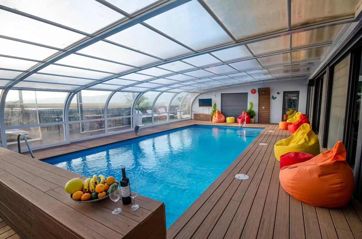 The pool is the heart of the upper level. This is a heated mosaic pool, very high quality and especially large. The pool does not contain chlorine but sea salt which is used as a natural substitute for disinfecting the water. Around the pool there is a high-quality "deck" and above it an efficient winter roof that opens in the summer. Adjacent there is an open balcony embedded with high-quality seating and lounging areas. The nature of the complex is highly recommended for two or three pairs of friends who wish to spend time together here.