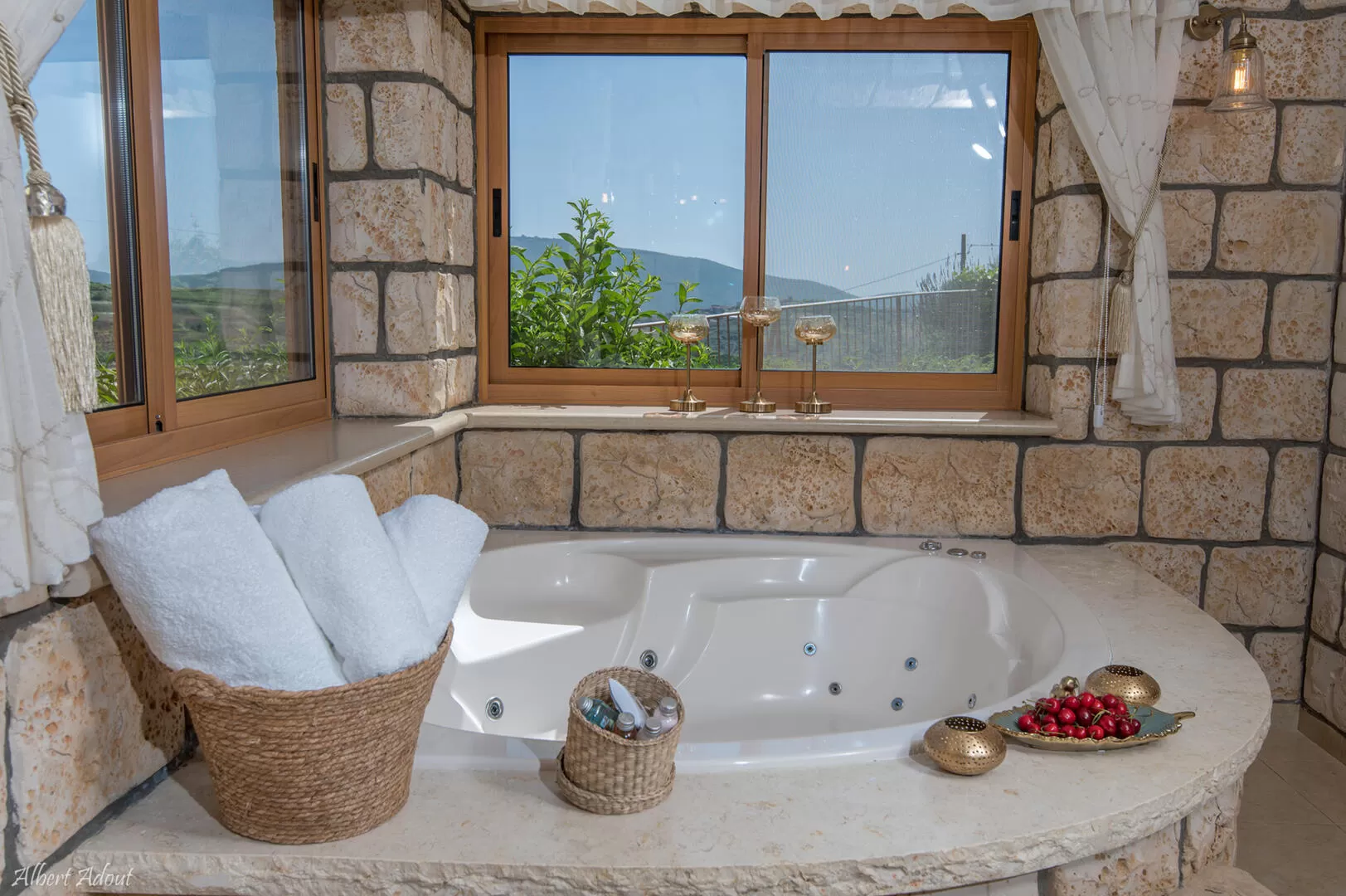 The "Eshkol" suite is built on two levels, with a partial stone wall and a staircase separating the living room space and the jacuzzi and the sleeping area. Huge windows with a view pour plenty of light into the suite and give it soft and flattering natural lighting. The design combines artisan works in stone, wood, glass and stained glass, uses a variety of colorful textiles, Afghan carpets, wrought iron figurines and wall pictures. A double jacuzzi in a stone frame is located next to the window with a view. The spacious double bed is located on the upper level.