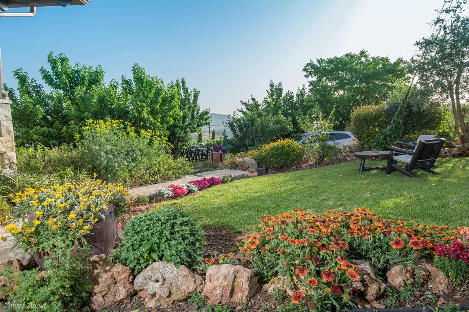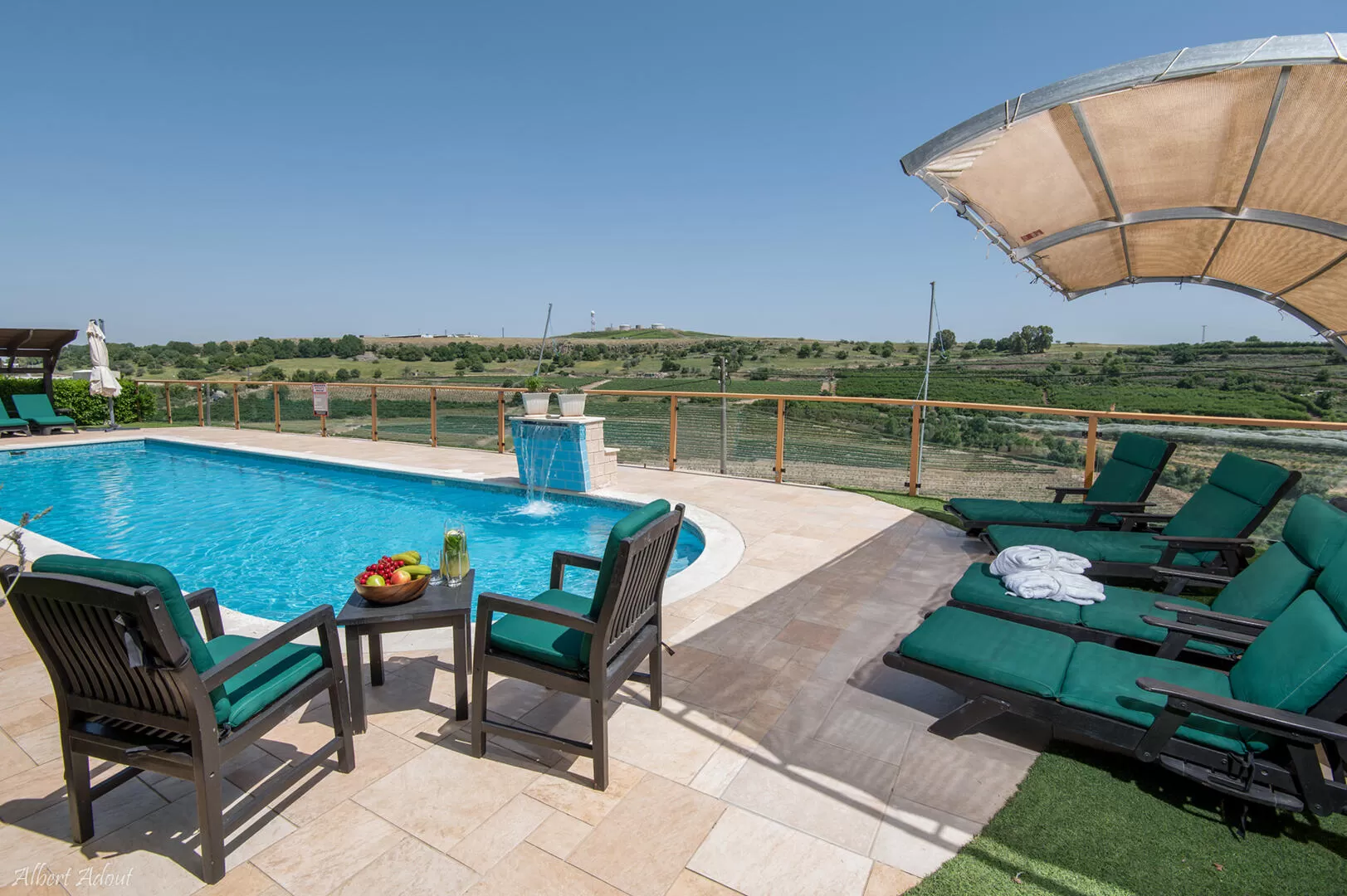 Shula, the host, directs me to the last house in the mountain village, and even before I enter I swoon at the view: a la Toscana vineyards spread over the slopes, and on the horizon - the green Mount Miron. We go up external stairs to the second floor, above the guest house, where 3 suites of different design and size await. The huge swimming pool (heated on the beach) can be seen from anywhere in the complex, and it itself faces the view.