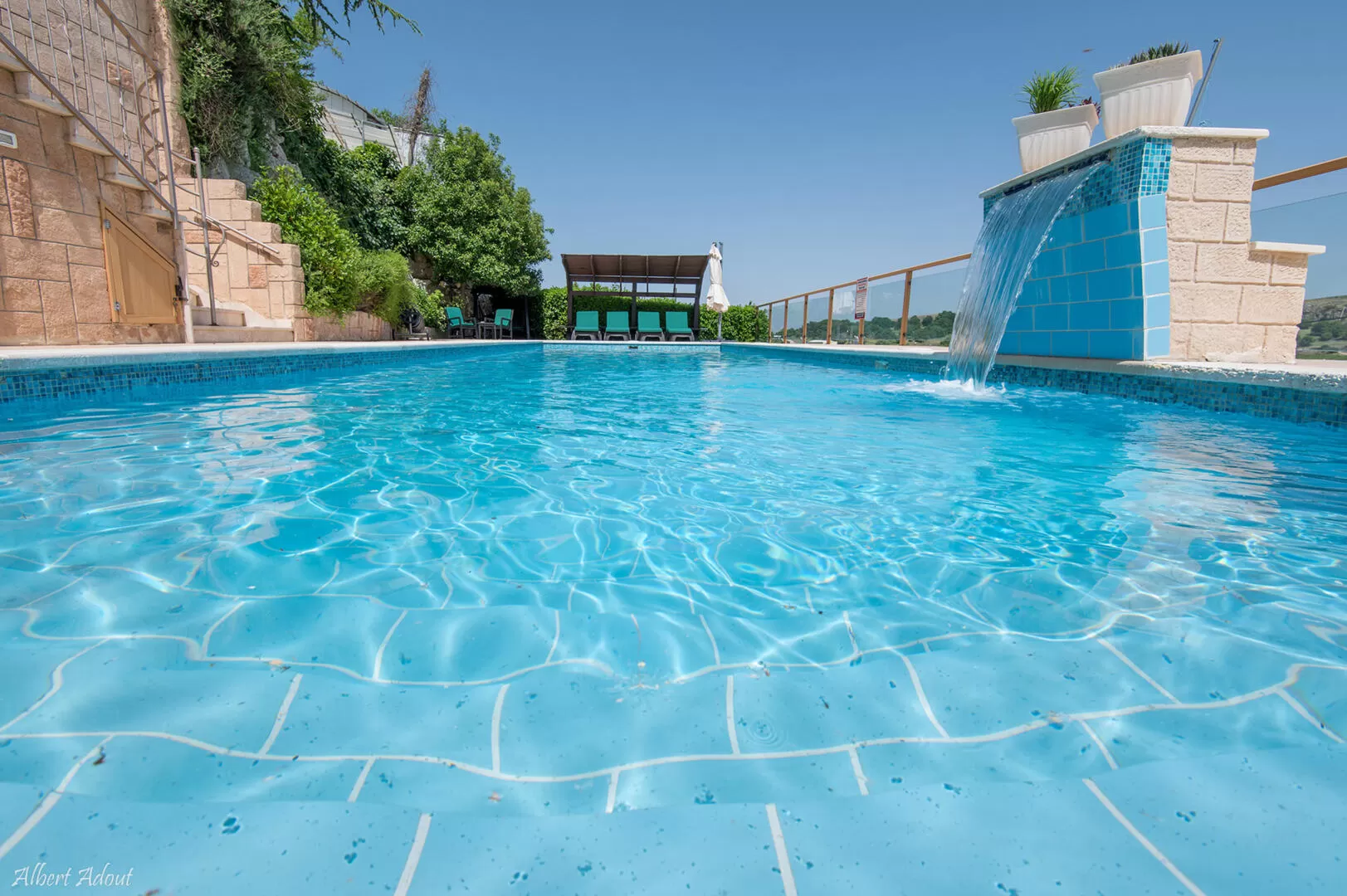 Just when I think I've seen everything, Shula leads me to the back of the house and I realize I haven't seen anything. We go down the stairs on the steep hillside, and below one of the most beautiful pools I've ever seen is revealed. Where to start? of the size? From the high standard? Maybe the vineyard crane across the street? When Shula says that she has already hosted a Prime Minister, I am surprised that only one