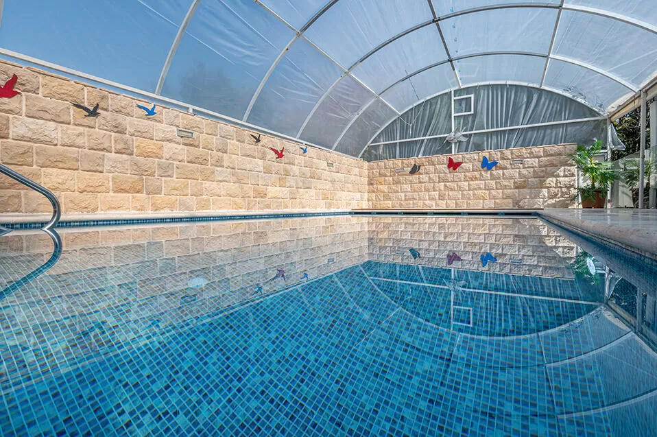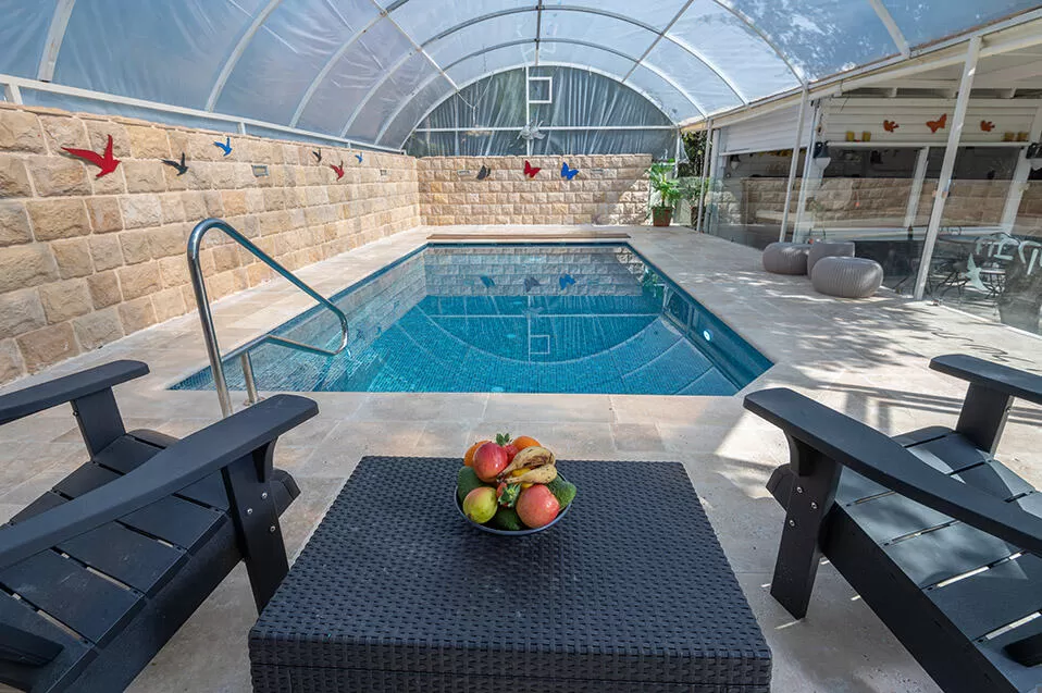 במתחם 4 בקתות שבנויות מסביב למתחם משותף ובו בריכה גדולה מחוממת ומקורה (העומדת בכל סטנדרט בטיחותי של משרד הבריאות, ופועלת עם בקר אוטומטי שאחראי לתהליך ניקוי וחיטוי המים) ומסביבה דשא סינטטי.