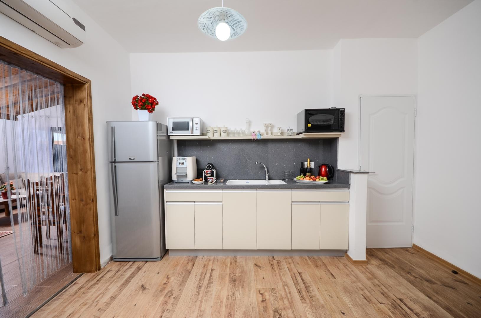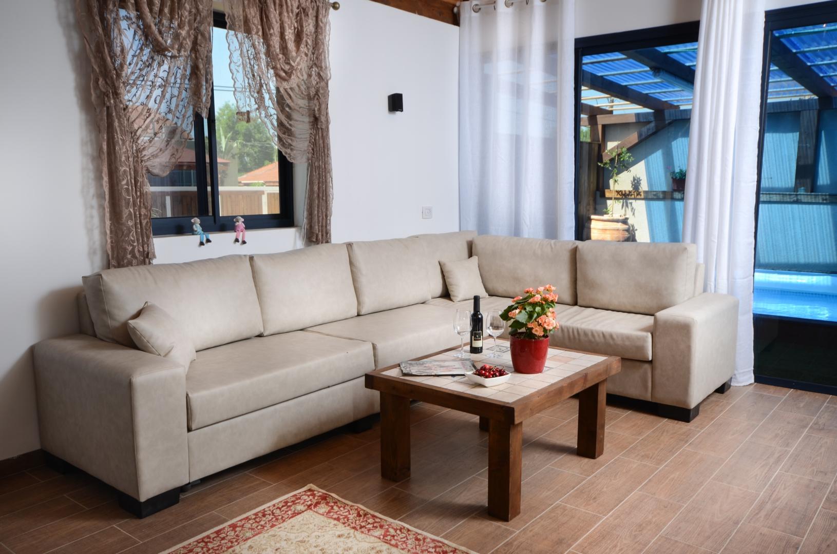 The villa - complete privacy Adjacent to the parking lot is a small yard with a sitting area and a stone barbecue area. Near the entrance door to the villa there is a fence with a door that leads to the area of the guest house and the complex's treatment room. The entrance to the villa leads to the living room area with a leather sofa, dining table and television (with a streamer of 300 movies, 60 inch screen).