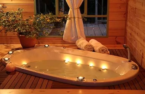 Is the bed high? do not worry!! If, God forbid, you fall from it, you will find yourself right inside the double jacuzzi sunken into the wooden floor. The jacuzzi looks out through the large window to the natural forest that surrounds the cabin. By the way, all the walls of the cabin are covered with windows made of Belgian profile in a light green shade and covered with delicate curtains in soothing pastel shades.
