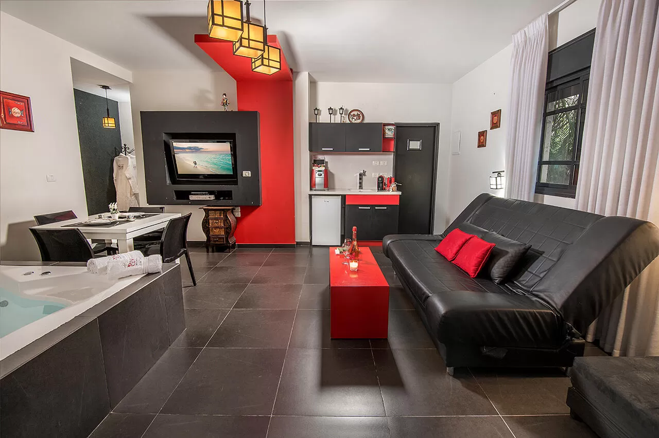 The Japanese unit is suitable for a couple with up to 3 children, designed in a Japanese style with references from the East. It boasts shades of black and red, and contains 2 spaces - a central space with a large double Jacuzzi, a sitting area, a sofa that opens into a bed, a TV, a dining table and a kitchenette (no cooking) with a refrigerator and a quality coffee machine. The adjoining bathroom has a comfortable and well-designed shower.