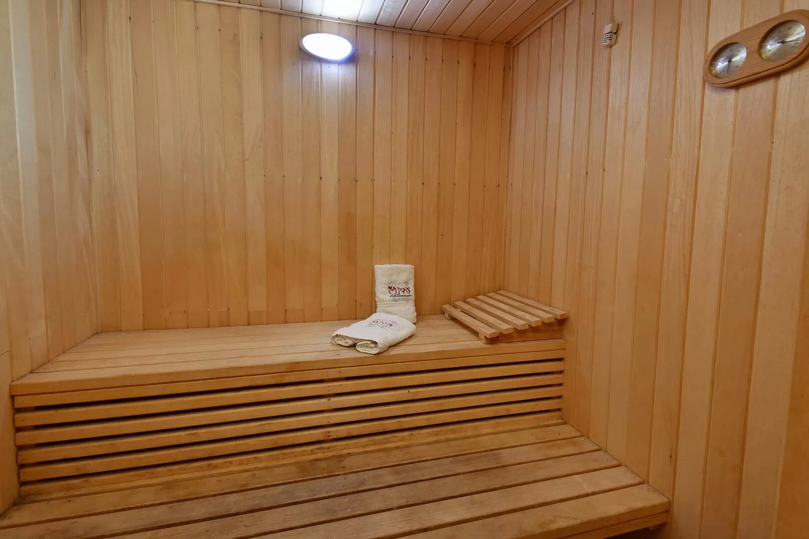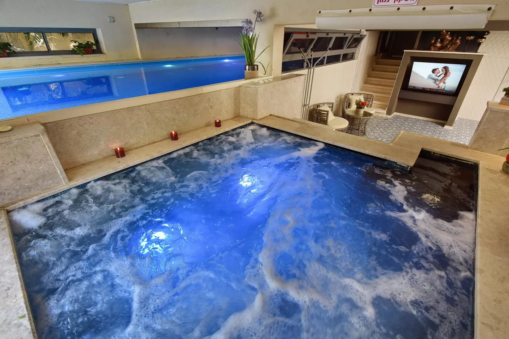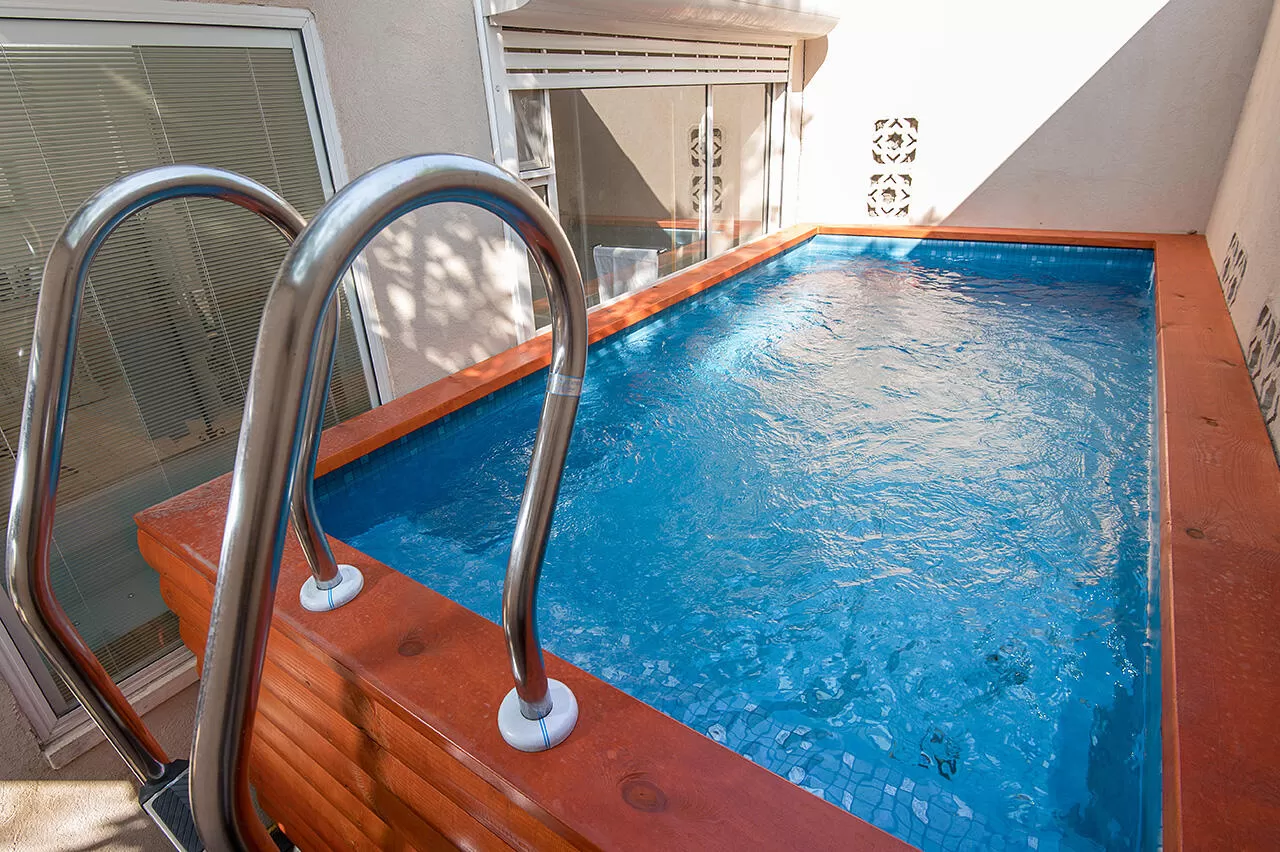 The transition to the private spa complex is through a corridor with a door (which can be closed) and is reached by going down 5 steps. The spa has seating areas, a kitchenette, a refrigerator, a shower (for a quick wash before or after the immersion) there is a spa jacuzzi designed for about 8 people and heated to 37 degrees, a huge pool (!) that is heated to 32 degrees, and a dry sauna that is suitable for 4 people.