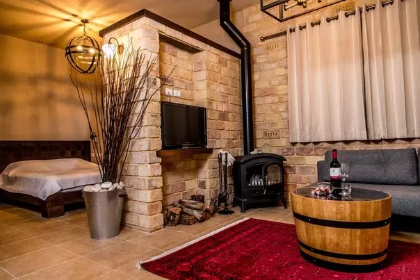 The space in the suites (identity) is divided into two spaces: in one space I found a cute equipped kitchenette and a sitting area with a comfortable (opening) sofa facing the view, the TV and the fireplace, and in the other space, behind a beautiful half wall made of recycled stones, resides the bed and the jacuzzi. All the decorative items and solid wood furniture were carefully selected, such as a coffee table that was once a wine barrel, and the charming rocking chair that gives the place a unique character and tone. The room opens to a small private garden with a fountain and a lawn. The view of the Golan Mountains appears partially between the villas on the opposite street.