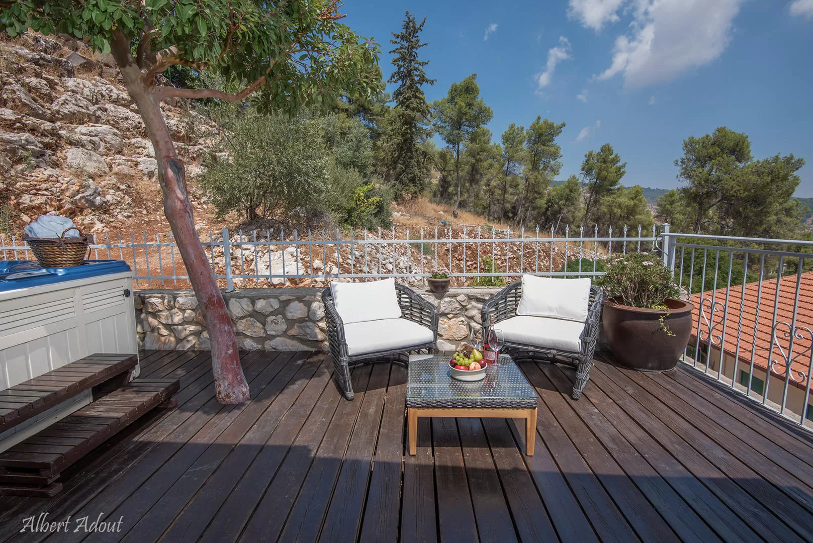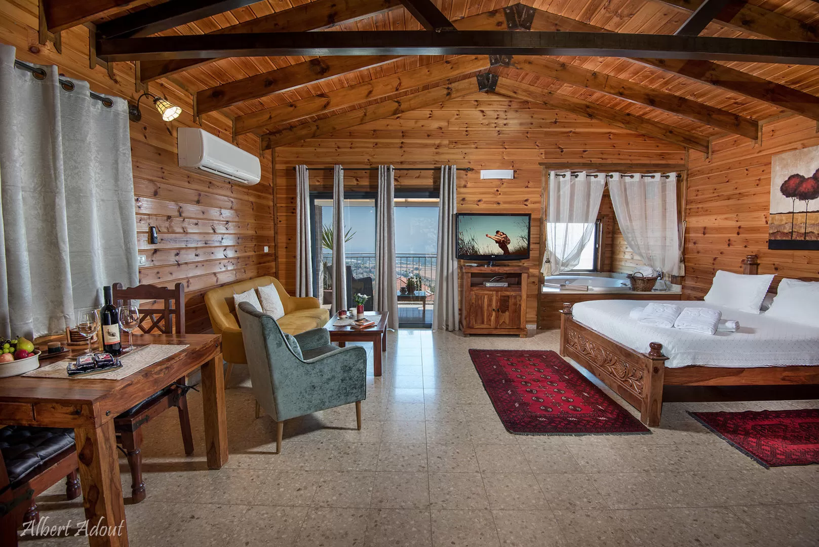 The two wooden cabins in the "Pina Behar" complex seem to "hang" in the air, above the tiled roofs of the Rosh Pina houses. The covered balconies are dotted with comfortable seating areas, allowing guests to enjoy spectacular views in luxurious comfort. In addition to the balcony adjacent to the entrance to the cabin, there is another outdoor area here, based on a wooden "deck", which also offers romantic cozy corners.