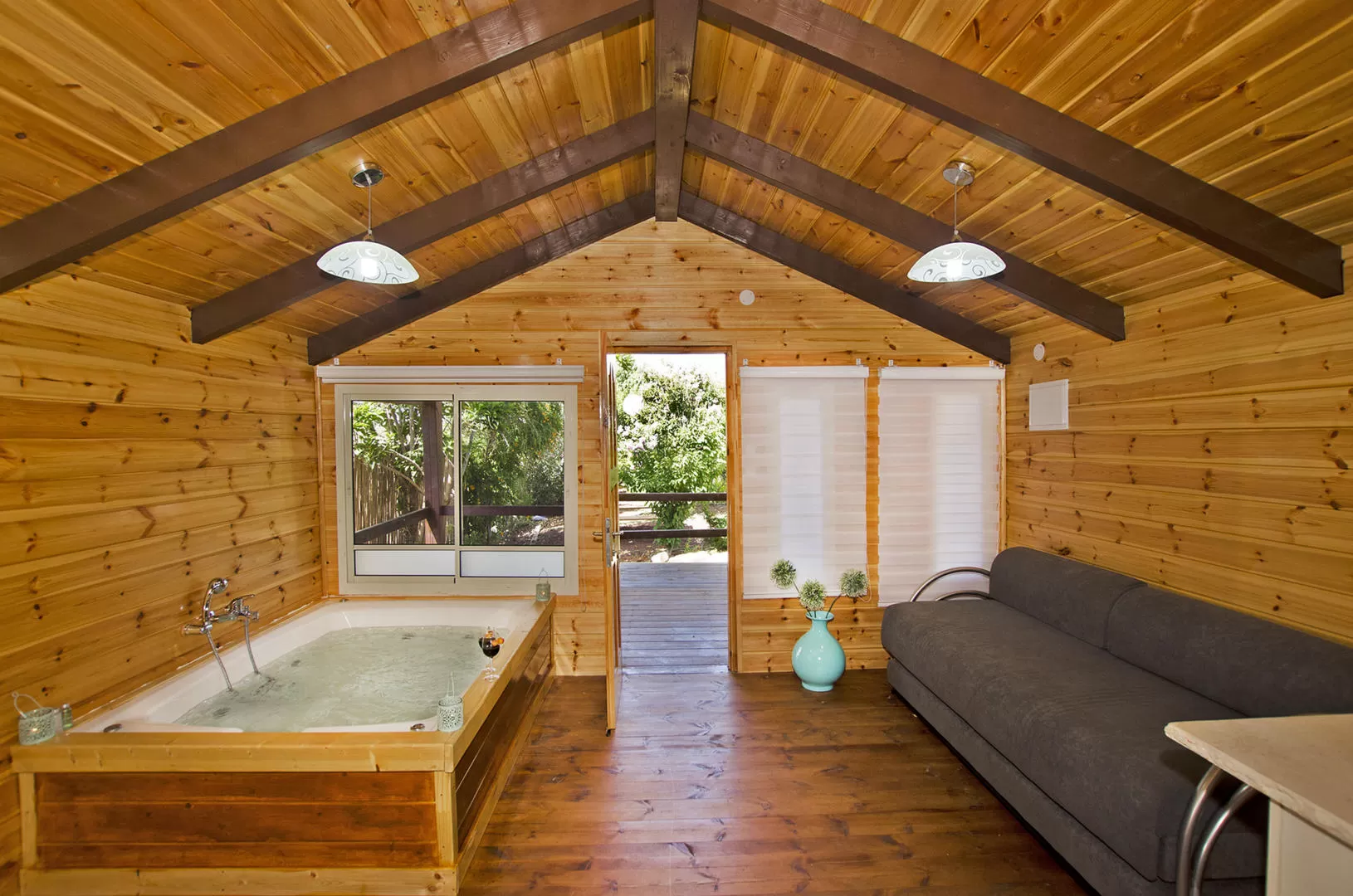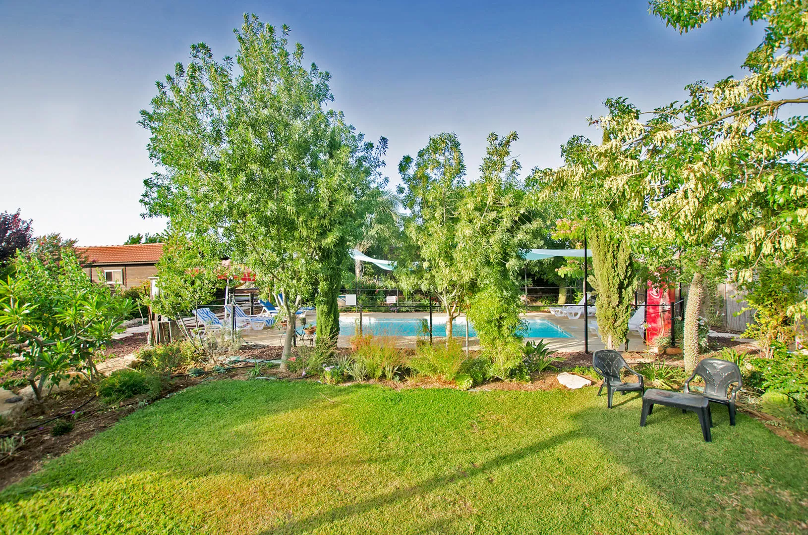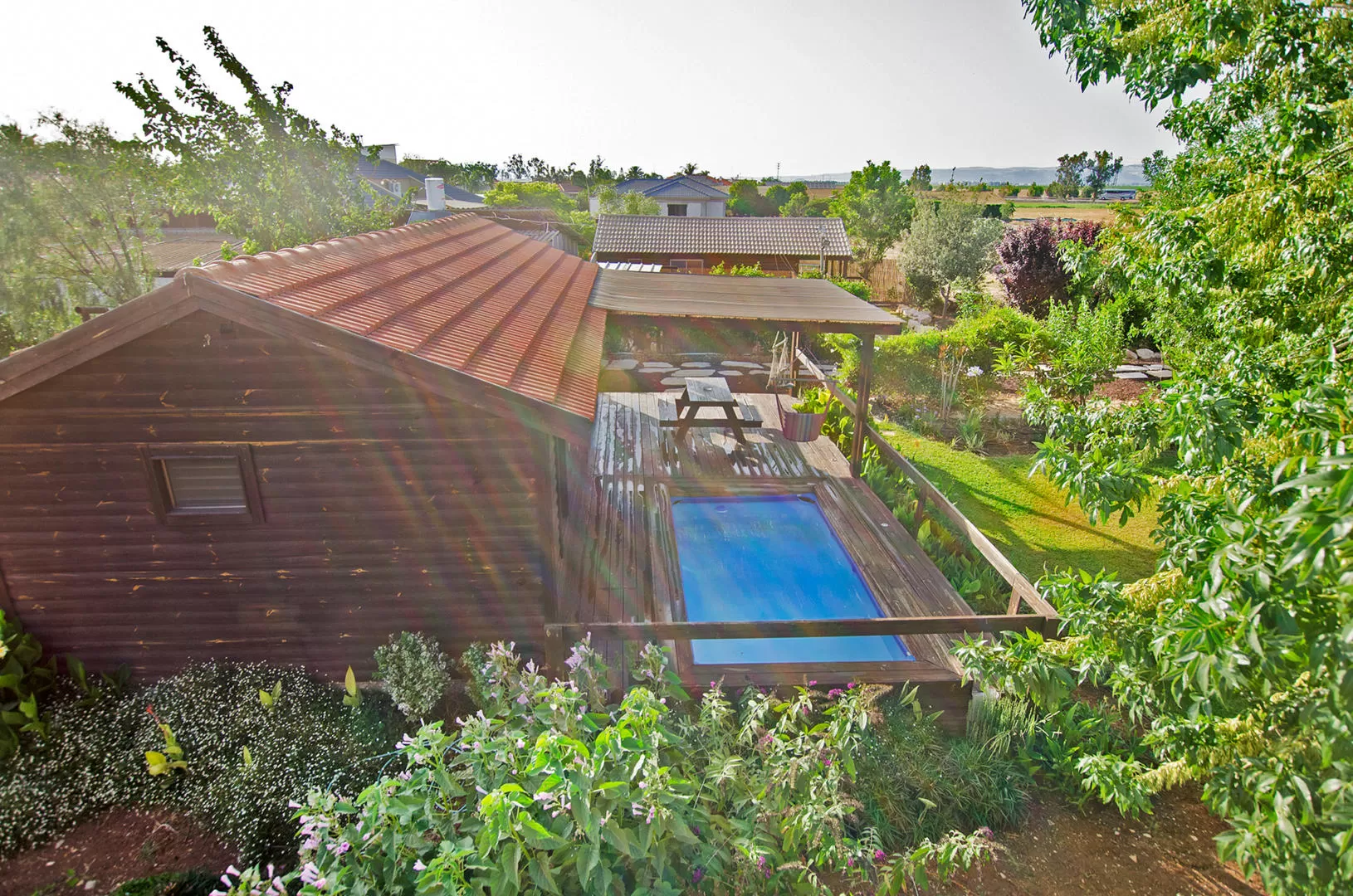 Inside the compound there is beautiful landscaping, but not in the "professional and cold" section, but the fruit of Sivan's mother's hands. The guest house is at the front of the compound, towards the road, but it is not noticeable at all because it is a very large property. The cabins are arranged in the shape of a large square, in the center of which is the common area with a built and heated swimming pool and sunbeds.