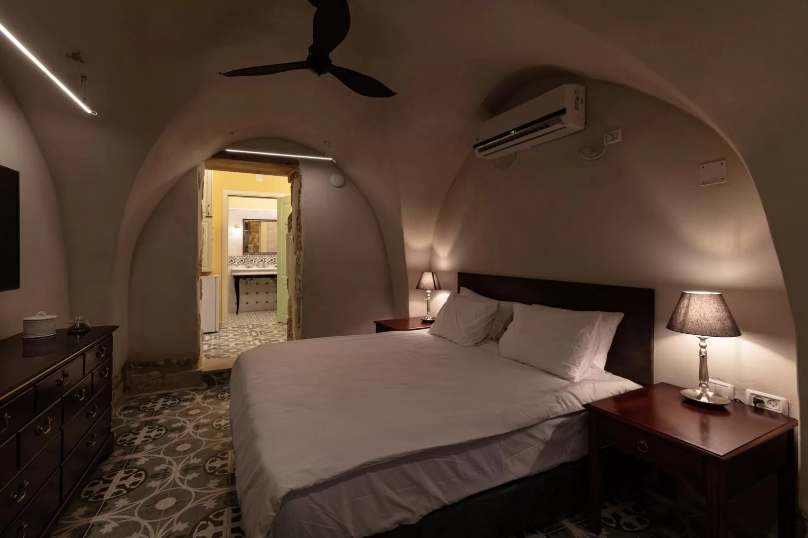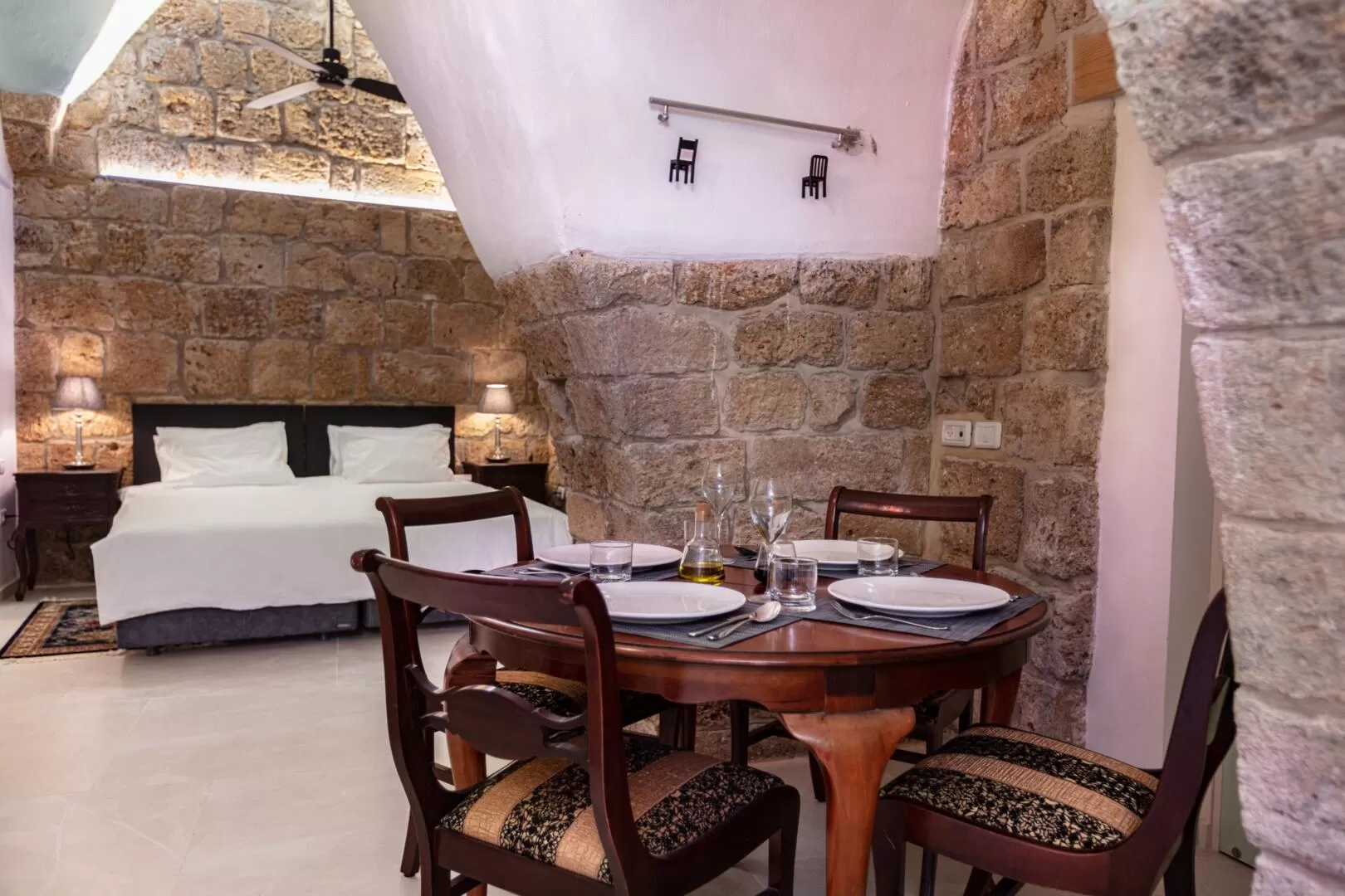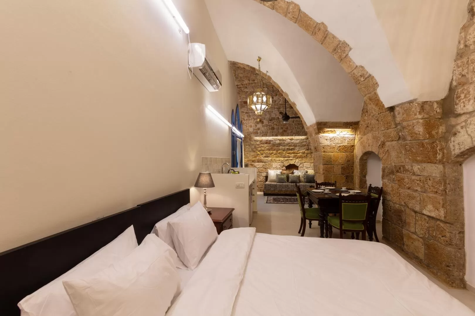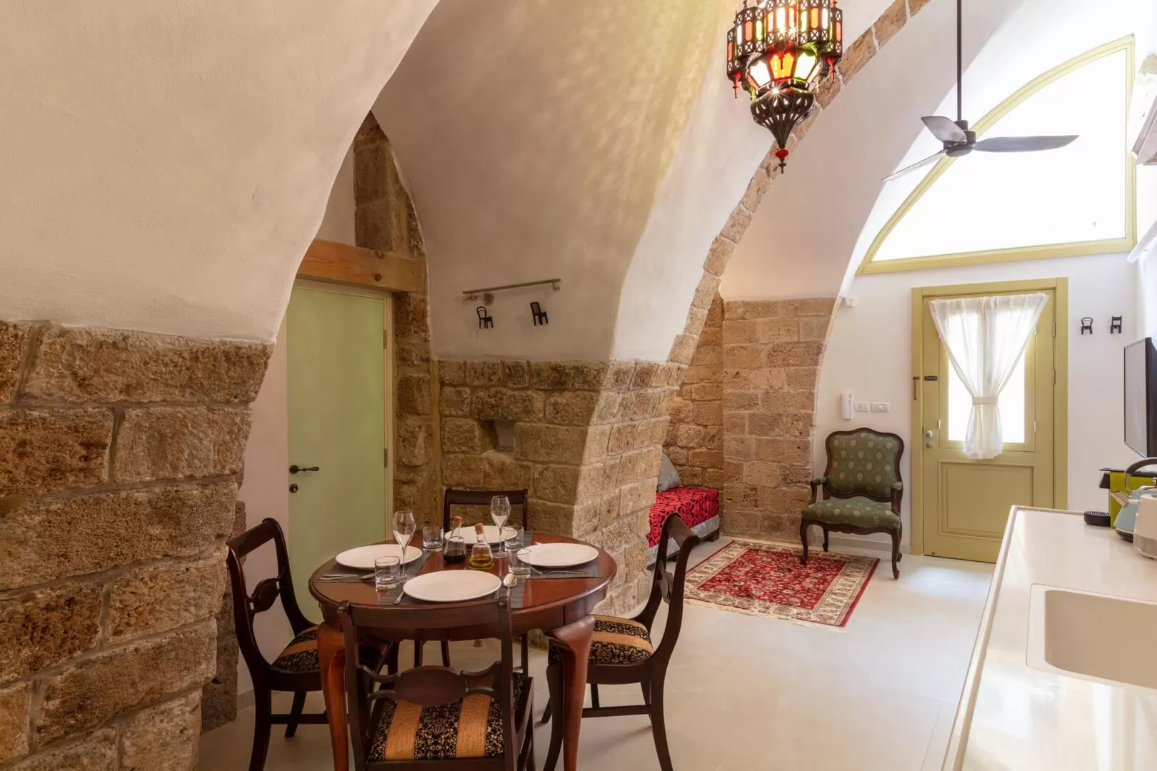 Jasmine, the Knights Suite and the Sultana - three boutique suites designed and identical in their area, which share a common outdoor area. The Knights and Sultana Suites are designed to accommodate up to 4 guests and the Jasmine Suite is perfect for couples. The design here is colorful, and tells the story of the place by combining Crusader and Ottoman motifs - high ceilings, arches, white walls, painted floors and authentic design items.