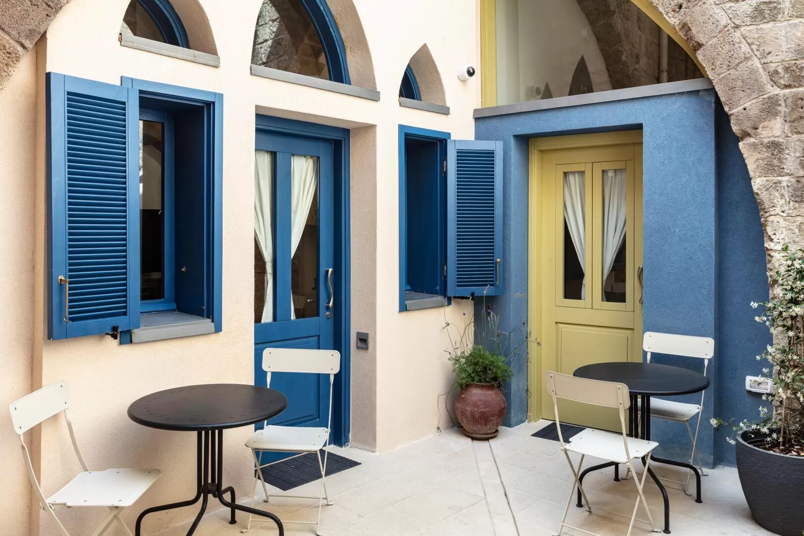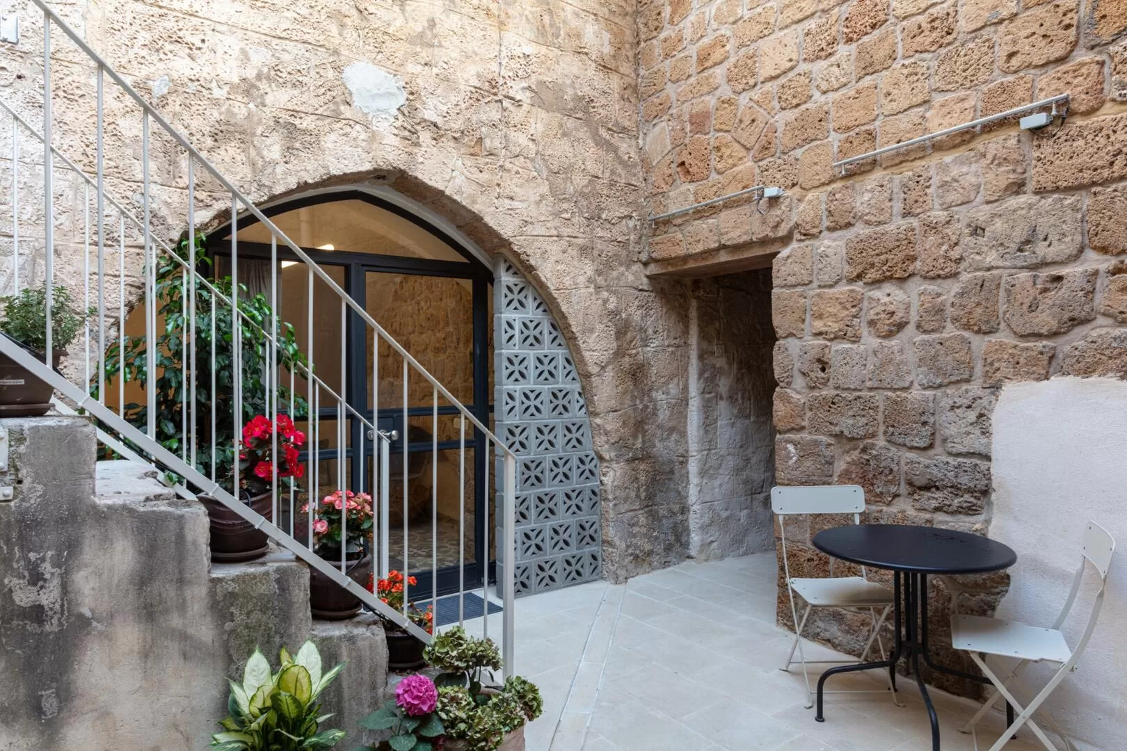 We walk through the alleys of Old Acre - the atmosphere here is special and feels closest to abroad. The entrance to the Alma complex is right here, in the beating heart of the historic city. We enter a large stone building, and discover a beautiful complex with an inviting patio and three separate entrances to Alma's suites. The staircase that stands in front of us in the center of the complex surprisingly leads to the house of neighbors who live right above the suites, so silence must be maintained here after 10:00 PM.