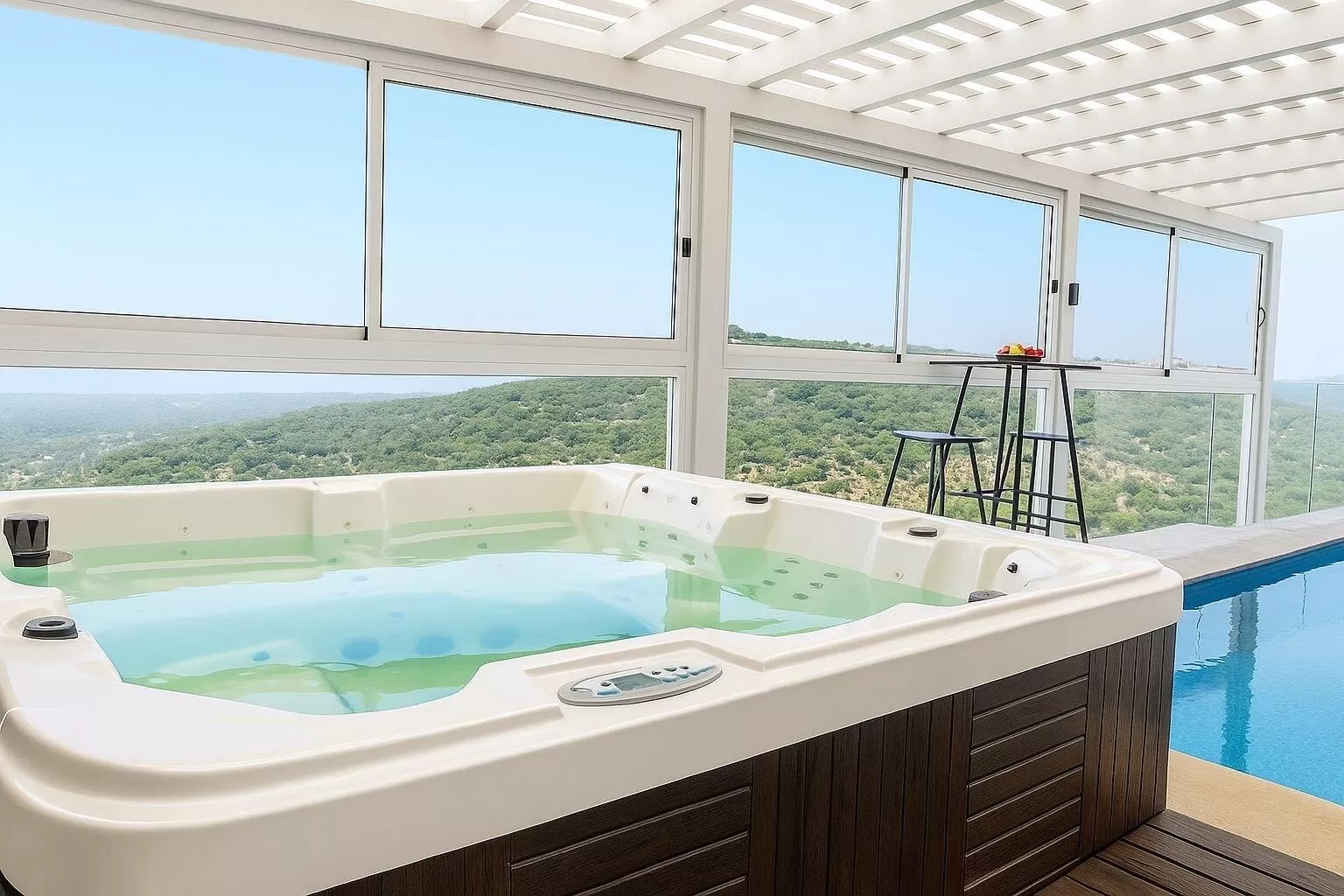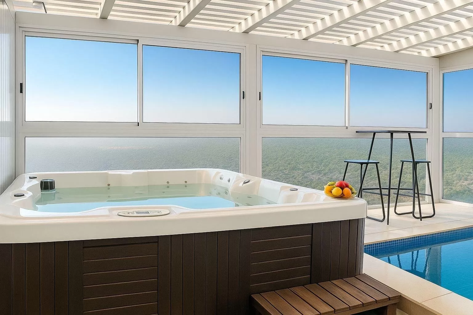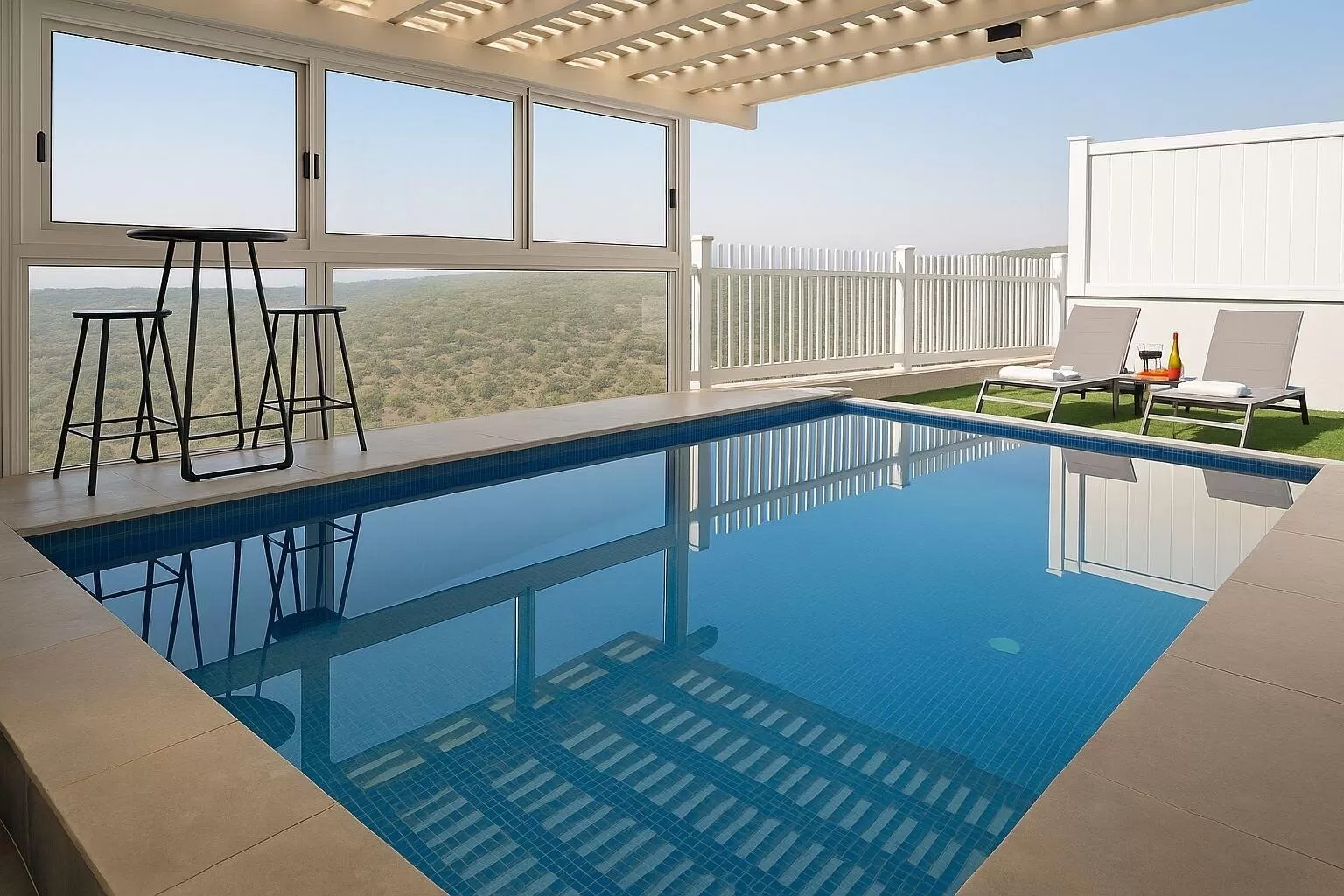 Next to the sleeping area you will find a super luxurious shower with two rain heads, bathrobes and cozy white towels. But the highlight here is absolutely the outdoor area with the private indoor and heated pool, which overlooks the gorgeous green landscape, which is simply hard to take your eyes off. The pool is fenced and safe, but of course when staying with children you have to pay extra attention.