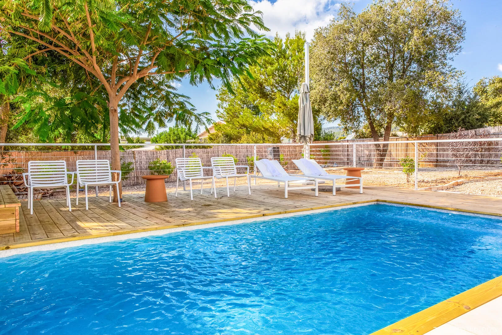 The villa's outdoor area is spacious and includes a 3x7 meter heated pool , lawn, pergola with seating area, dining area with TV screen next to it, campfire area, barbecue area with outdoor kitchen, outdoor shower and sun beds. Heated all year round except July to September inclusive