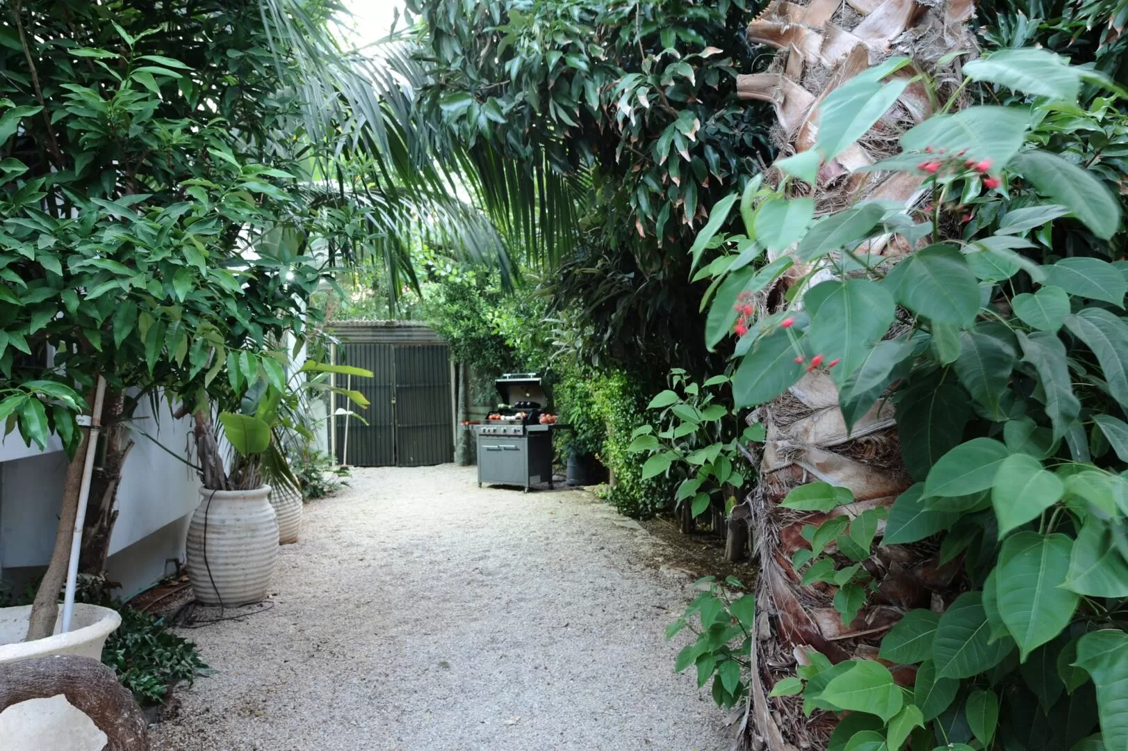 Villa Rouge is located in a quiet neighborhood surrounded by fruit trees and green vegetation and is built on two levels. At the entrance, a well-maintained path leads us to the courtyard area, where on one side a charcoal barbecue corner awaits you, and on the other side a path leading to the private pool and the front door.