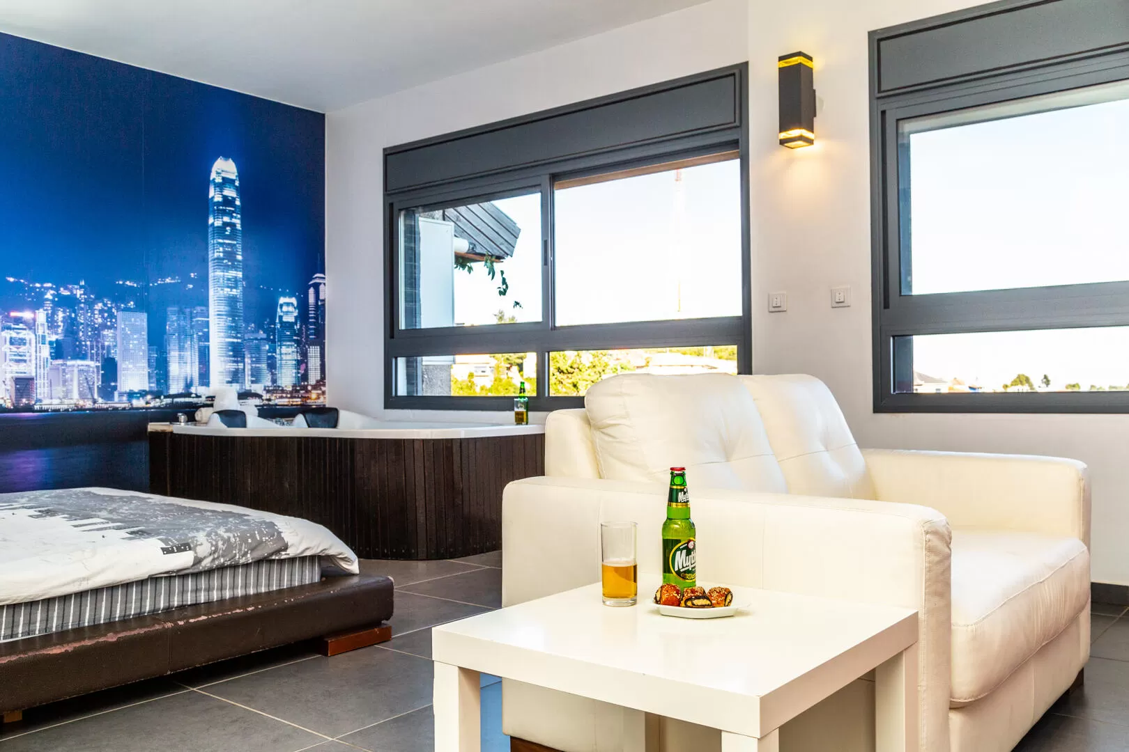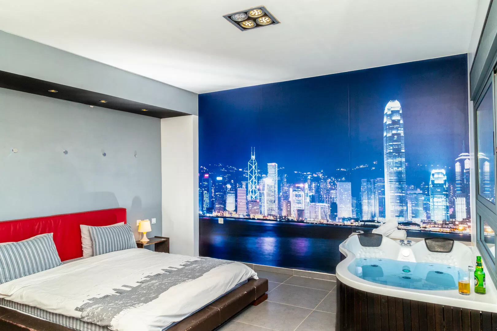 Further down the corridor you will reach the two lofts - New York and Hong Kong, which are equipped in the same way (almost) and designed in an urban style similar to the classic lofts of the past. There is a black floor, a cream-colored leather sofa and a red carpet, lighting games with spots on the walls and ceiling, and a brick wall that corresponds ideally with the design line. In each loft you will find a wide double bed, a sitting area, a functional kitchenette, a private and well-designed bathroom and a double jacuzzi. A large wallpaper stretches on the wall behind the bed, showing the views of the city named after the loft where you are staying. When you pamper yourself in the jacuzzi it will totally add to the atmosphere.