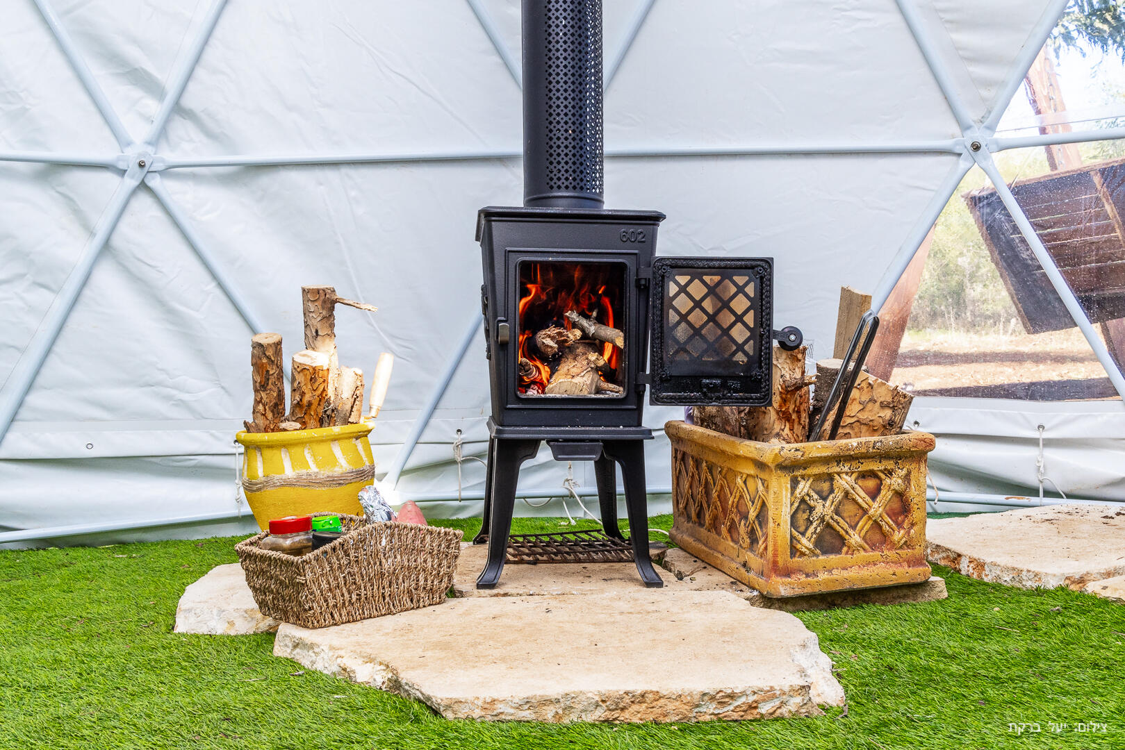 The super cool highlight of the place is the pop-up tent here, which features: a fireplace, the option of a king-size inflatable mattress (200X220), the option of cooking vegetables in a campfire-style fireplace, and a coffee and tea corner.