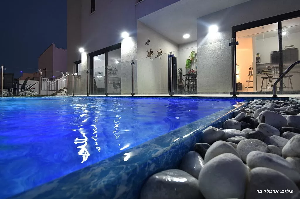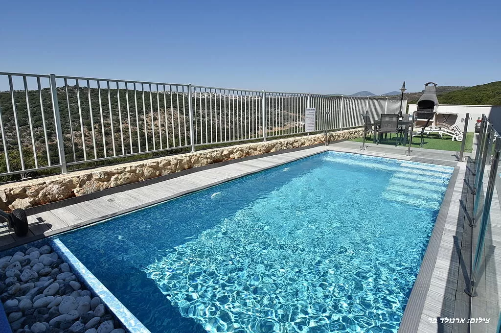 In the outdoor area shared by the suites, there is a heated pool with currents that both suites face. Each suite has its own barbecue area, with sun beds and a cozy dining area, and everything sits right "on" the view. The outdoor area also includes a high-standard spa jacuzzi, located at the left end of the area in a covered building with glass windows facing the view, which provides both a sense of privacy and the possibility of enjoying the jacuzzi in the winter season.