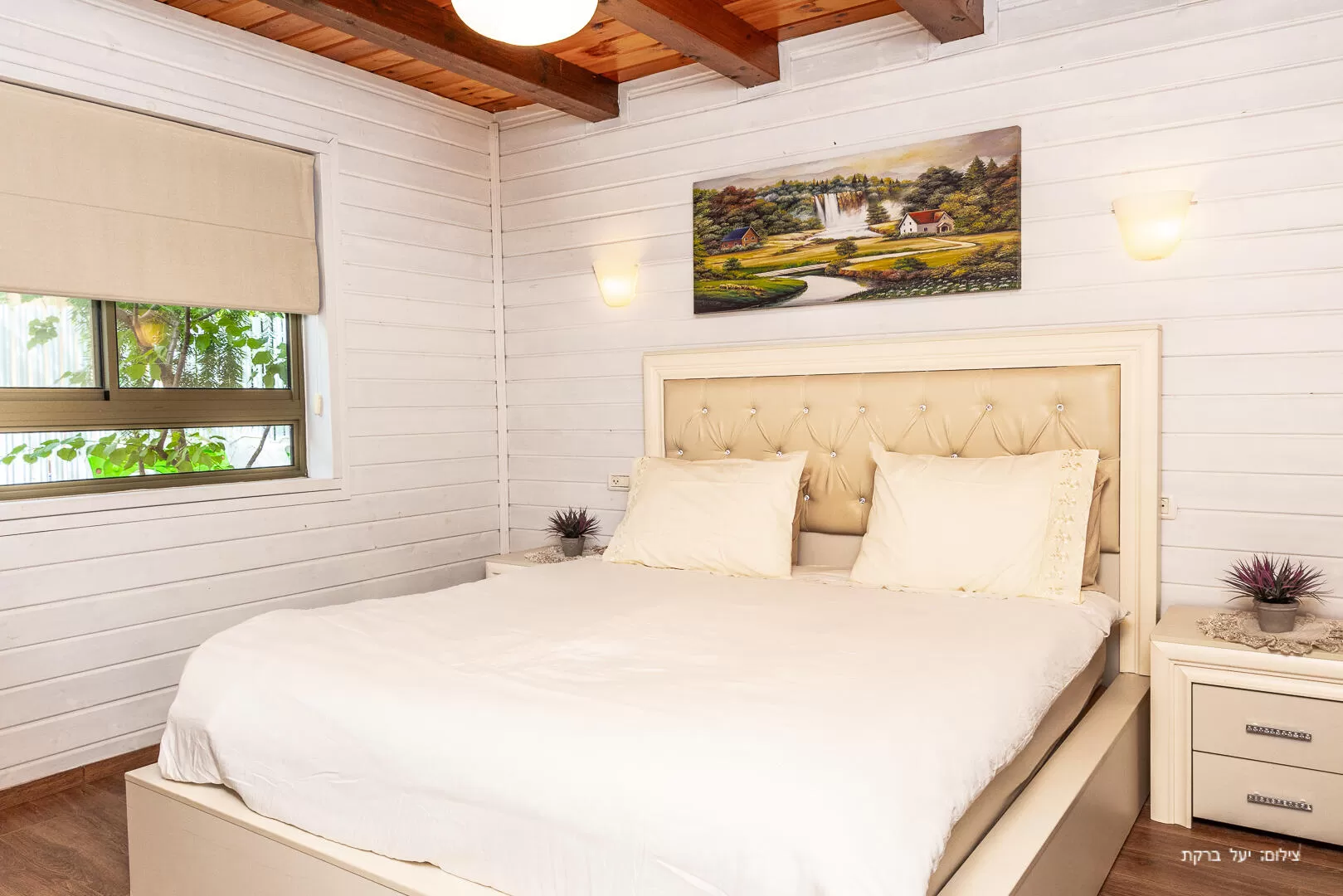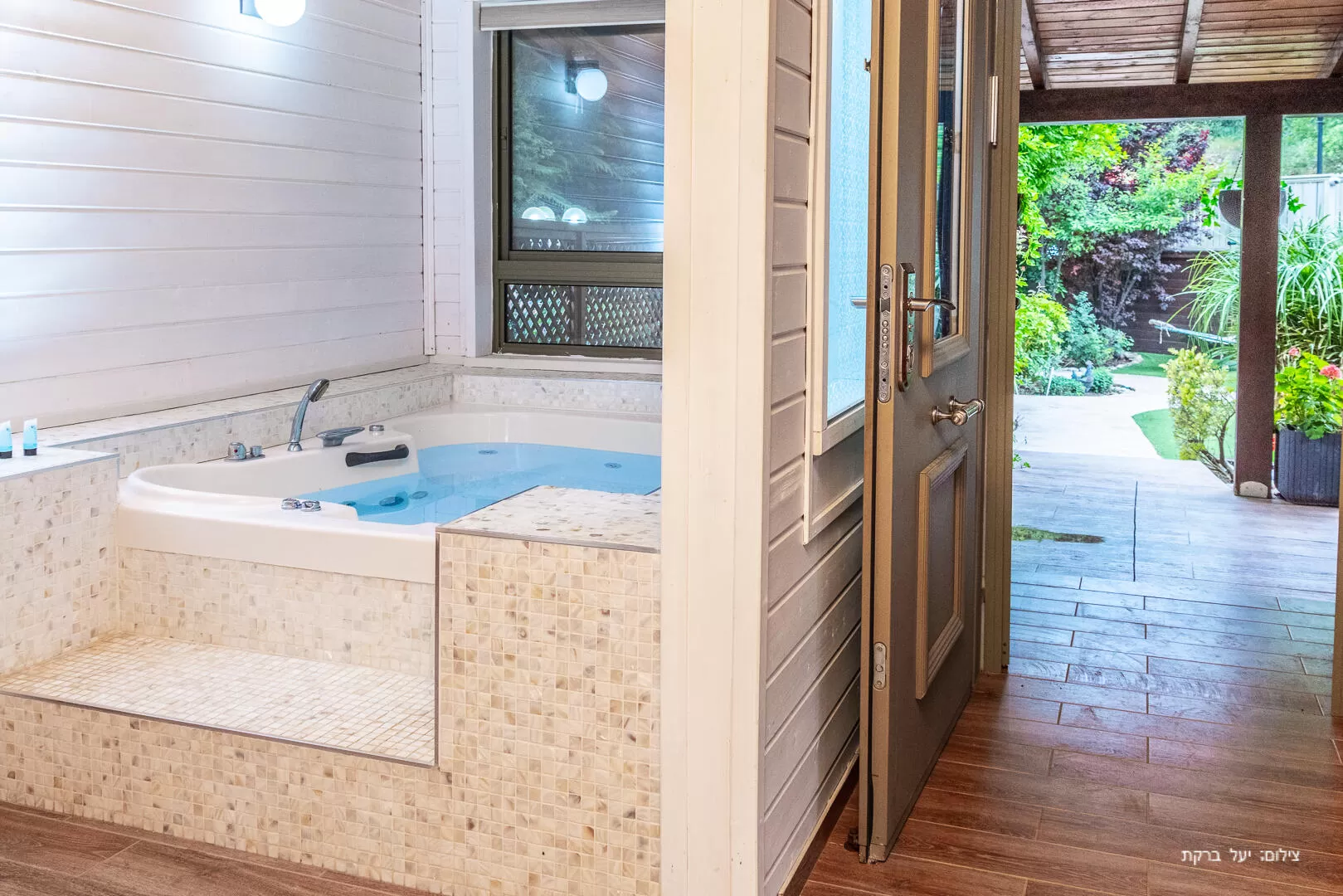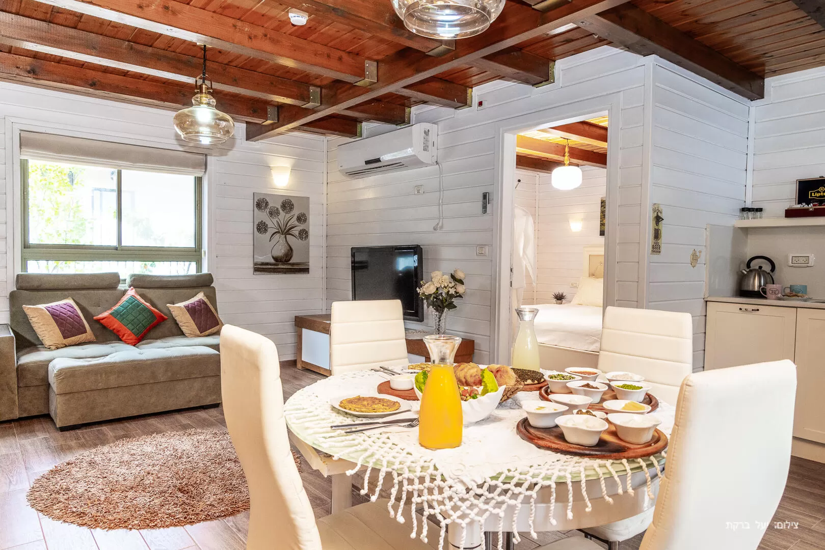 Ahuza Bateva offers two two-story wooden cabins , each suitable for a couple with up to 5 children. On the entrance floor is the living room and kitchen area with a dining area, and the master bedroom with a bathroom and attached toilet. The cabins are cozy and clean, and the wood from which the cabins are built gives a feeling of warmth and a pleasant rusticity. The treat of each cabin is undoubtedly the spacious square jacuzzi.