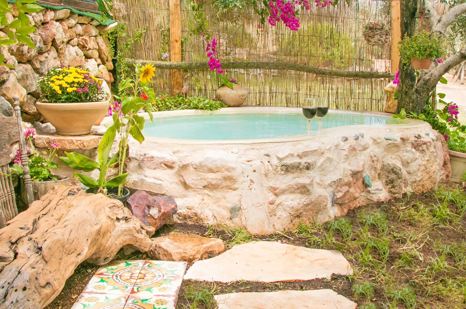 The Vineyard Cabin contains a sleeping area for parents and another room for small children where sleeping is on a pull-out sofa. Its outdoor area is located next to an olive grove, and offers an outdoor kitchen for basic cooking, seating areas, a campfire area, and a luxurious plunge pool that can also be filled with hot water. The feeling here is natural and pleasant, the proximity to the olive grove creates a rustic tranquility, and an evening dip in the small pool completes the picture just right.