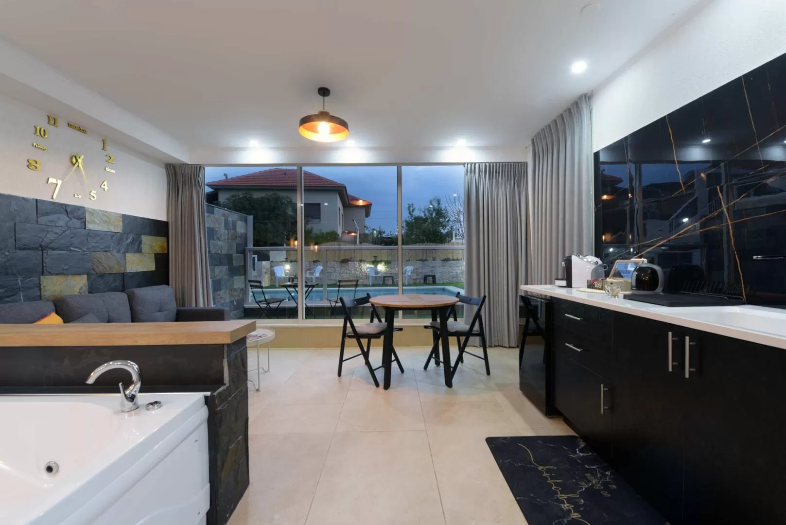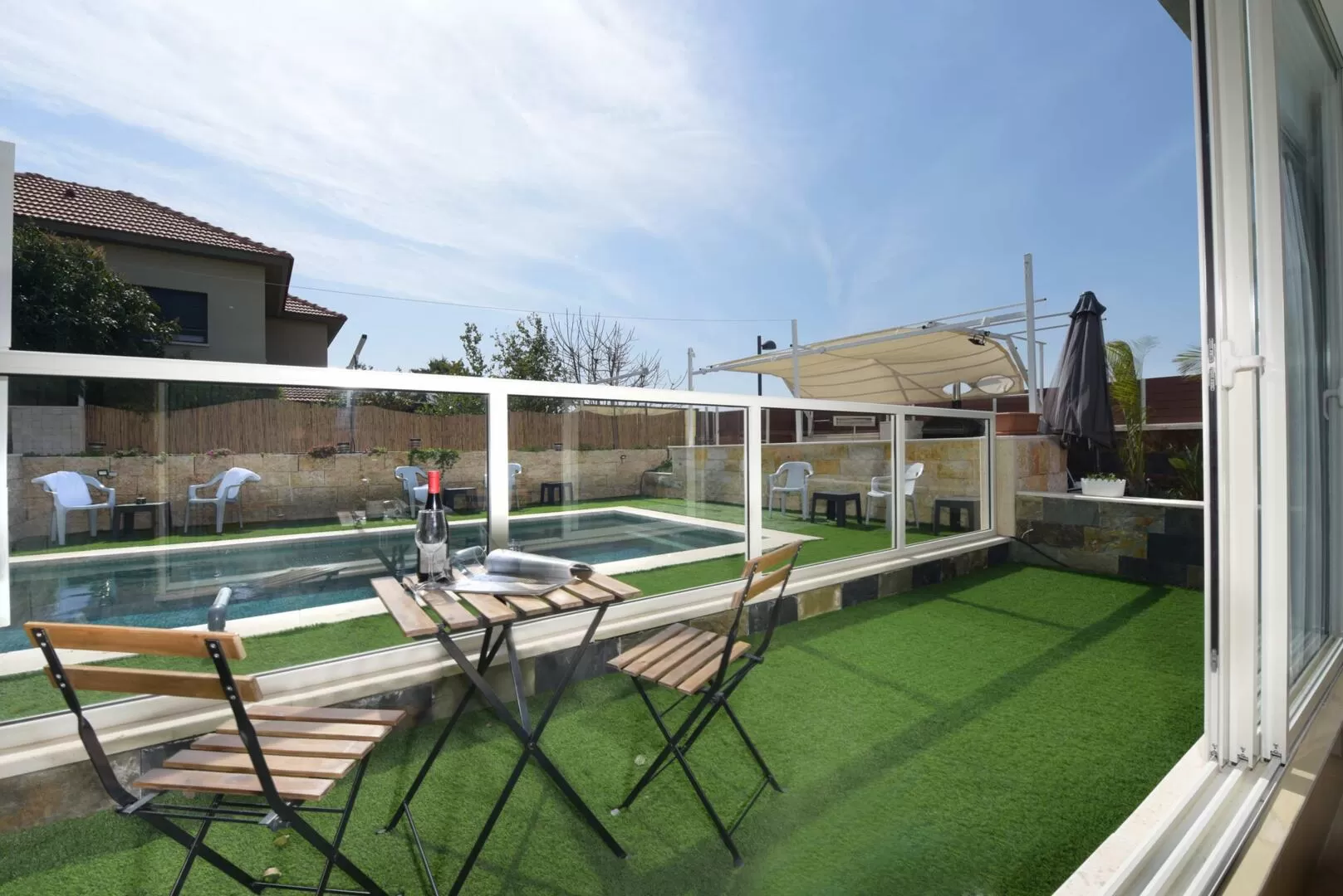 The shared outdoor area offers, first of all, a beautiful, well-built and large pool, heated and well-fenced with a child safety gate with a code. Inside the pool there is a bench with a built-in jacuzzi, and a beautiful waterfall that is fun to wash in and listen to the fickle sound it makes. In the winter, the pool is covered with a roof that retains heat, and it is removed when the temperatures start to climb.