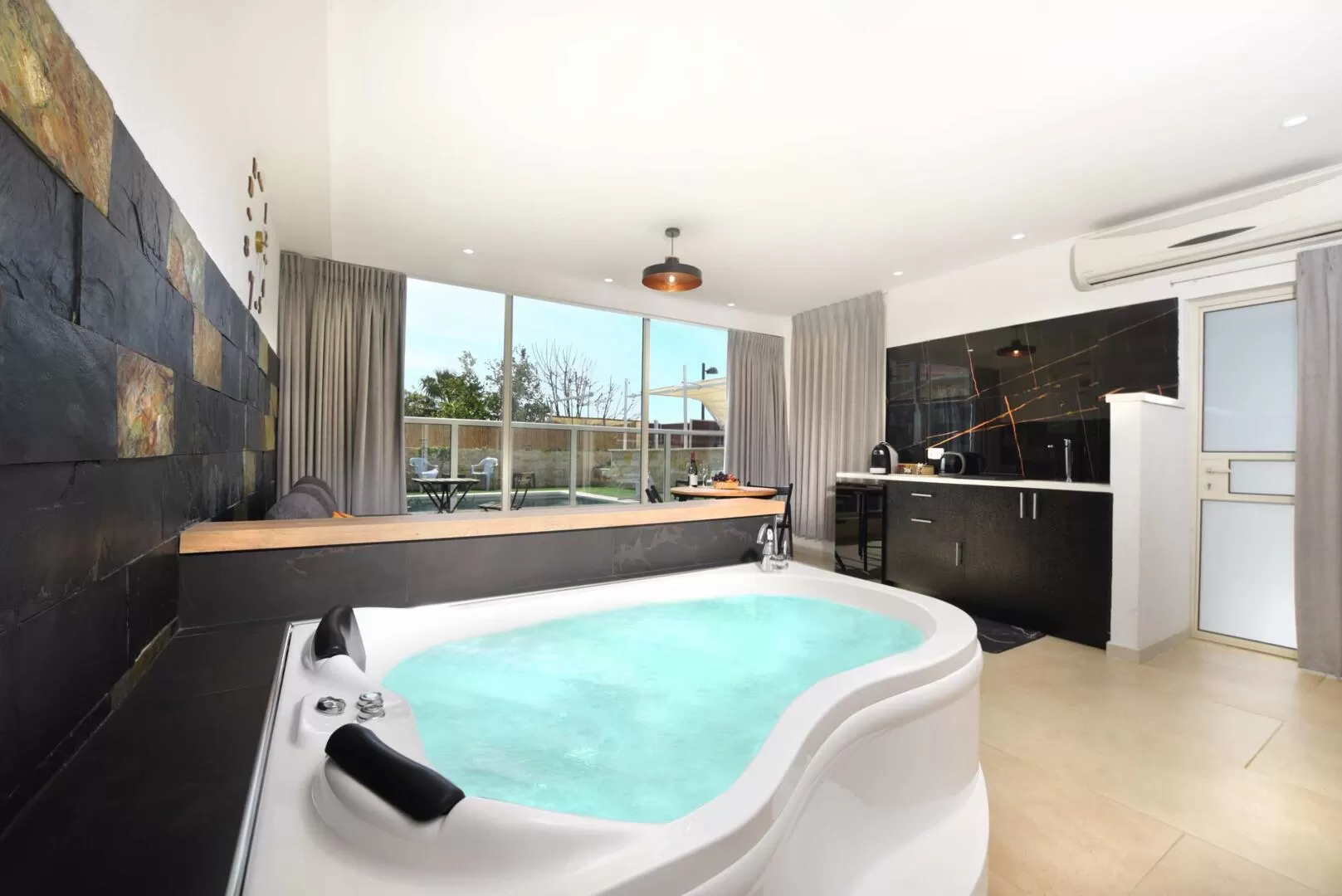 The complex is spread over two levels, with two adjoining suites, a pool area and an outdoor kitchen on the lower level. On the upper level are three more suites (one of which is the family suite), and a spacious balcony overlooking the view. In total, there are five spacious and well-maintained suites, each with a private balcony, private bathroom, sofa bed in the living room, and a double jacuzzi inside the suite (except the family suite). The family suite has a separate bedroom for children.