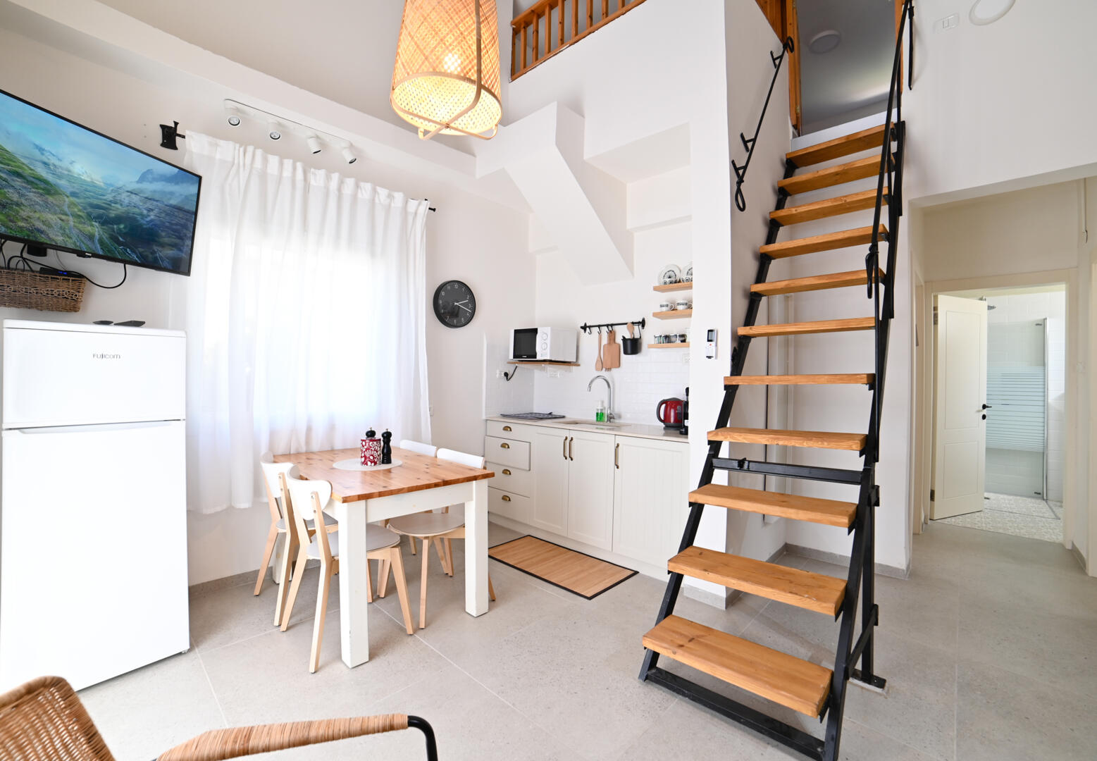 The "Nof HaEmek" accommodation complex is suitable for up to 32 guests, with each cottage suitable for up to six adults and two children. Each cottage is built on two floors: a lower floor with a living room with a sofa bed, a kitchen area, a double bedroom and a bathroom. The upper floor is a gallery floor with a safety gate, which has single beds for children and a small bathroom.