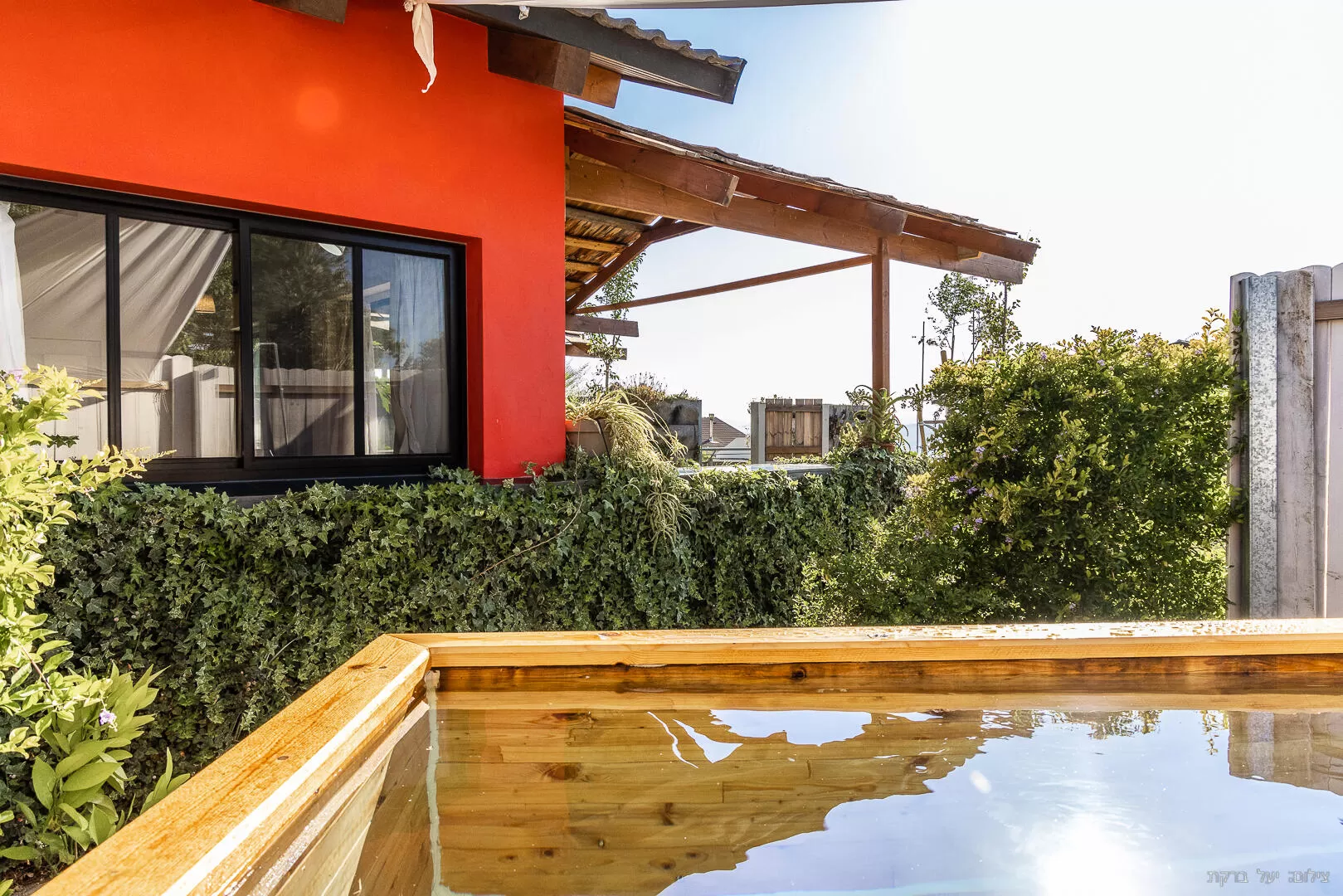 In the Ma'ale Gamla settlement above the Sea of Galilee, there are two magical cabins. These are two stone cabins that were built and designed by hand with great care for the materials and quality of construction. The cabins are adjacent to each other, but each has its own private yard. As their name suggests, one cabin is painted red, and the other is green. The combination of materials here is particularly impressive: using wood in its various forms, working with the local basalt that is embedded in the landscape on the way to the settlement, a combination of large glass windows, and the right lighting - all of these create a unique B&B here, with a homely and intimate feel. From the B&B's garden, you can see the houses of the settlement, and beyond them, the eye catches a glimpse of the mountains and the Sea of Galilee, which is a few minutes' drive away.