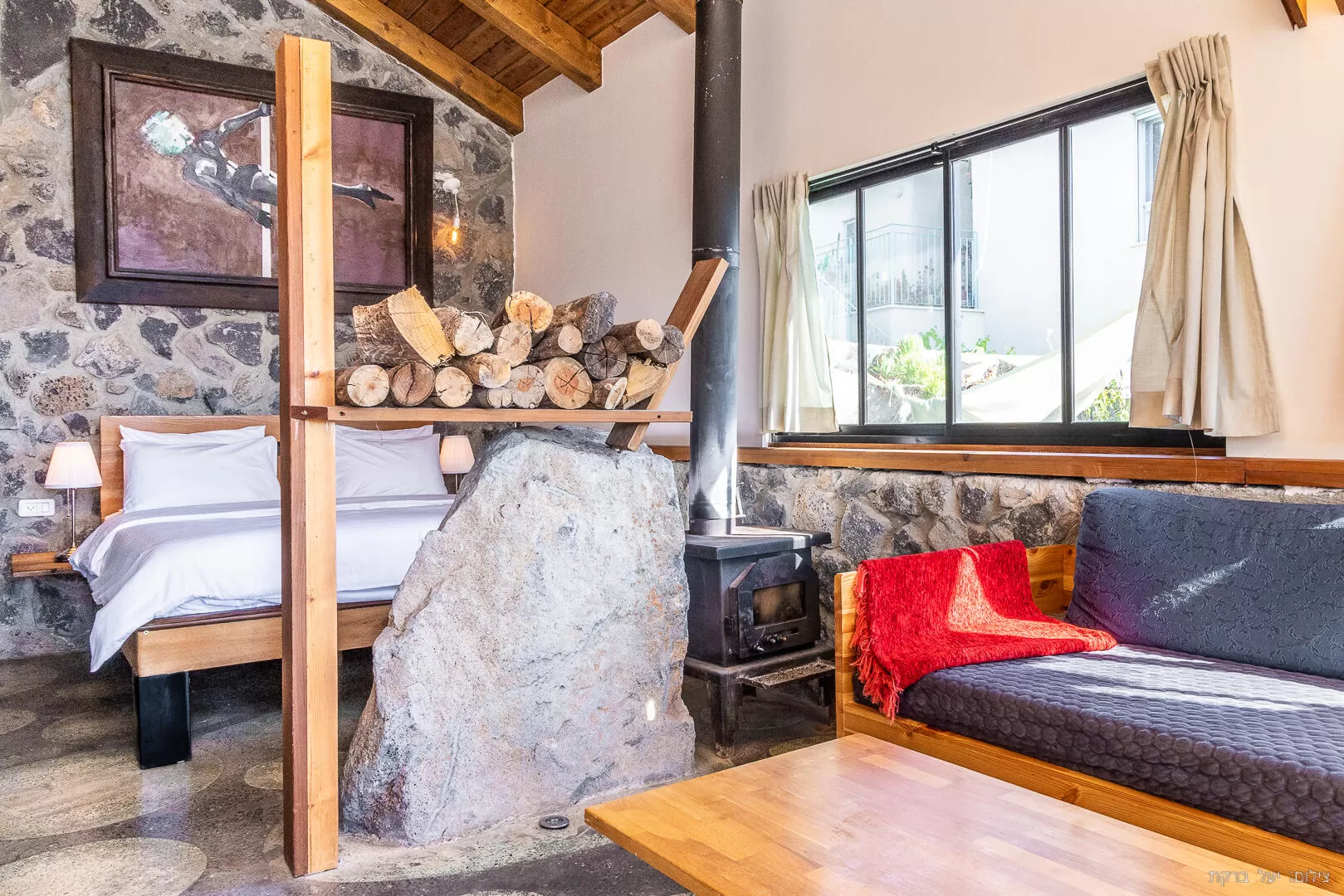 These are two stone cabins that are suitable for hosting couples or small families. The cabins are built as one space with one sleeping area with a double bed, and the living room space with a pull-out sofa. Between them is a partition of no less than a large basalt rock with a stack of wood on top, which you can use to light the fireplace in the winter. Next to the rock is a small wooden door that can be closed if you want some privacy. The wall behind the double bed is built of beautiful basalt stones, as are some of the walls in the rest of the cabin. The bathroom is luxurious with a double shower with two large rain heads, and the special floor is paved with smooth black basalt. From here there is a direct passage to the private sauna that overlooks a lovely patio with green plants, and when you look up you will find another rain head that you can enjoy even while sitting here.