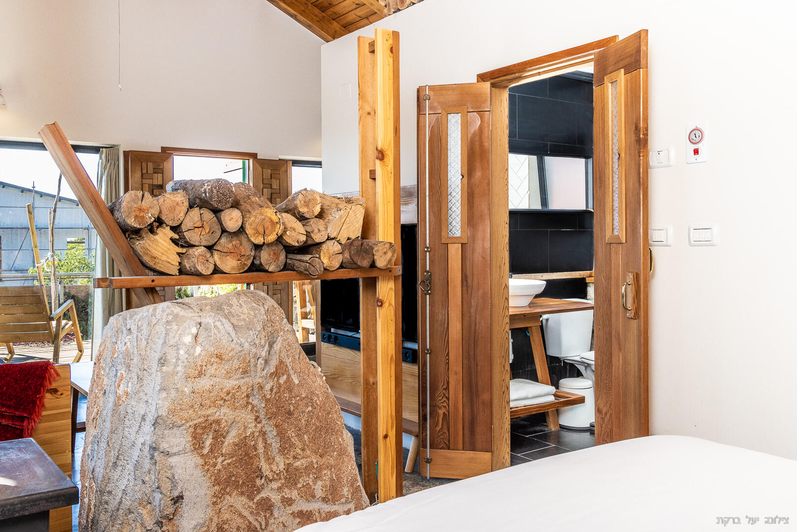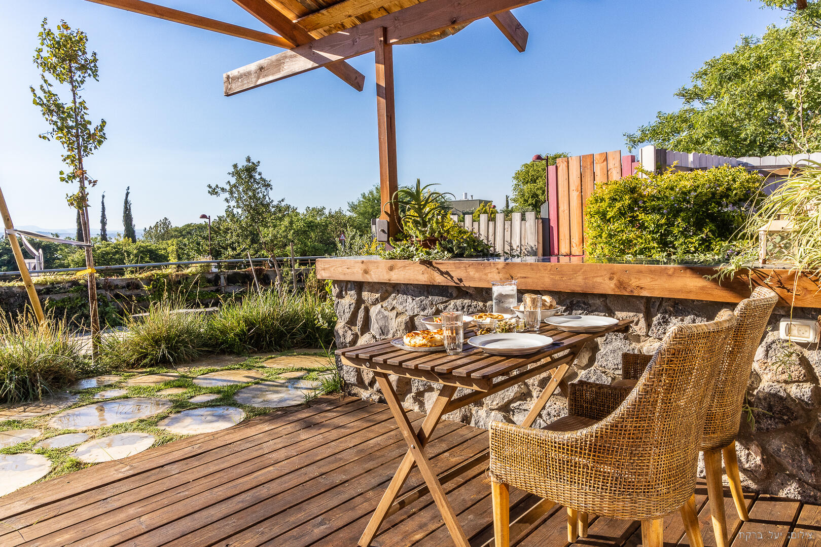 In the Ma'ale Gamla settlement above the Sea of Galilee, there are two magical cabins. These are two stone cabins that were built and designed by hand with great care for the materials and quality of construction. The cabins are adjacent to each other, but each has its own private yard. As their name suggests, one cabin is painted red, and the other is green. The combination of materials here is particularly impressive: using wood in its various forms, working with the local basalt that is embedded in the landscape on the way to the settlement, a combination of large glass windows, and the right lighting - all of these create a unique B&B here, with a homely and intimate feel. From the B&B's garden, you can see the houses of the settlement, and beyond them, the eye catches a glimpse of the mountains and the Sea of Galilee, which is a few minutes' drive away.