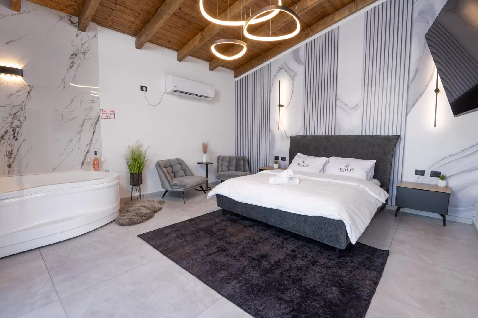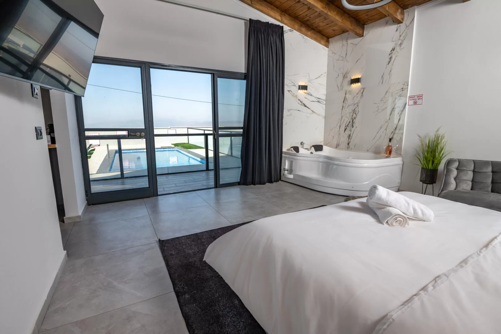 The suites are similar to each other, but the choice of colors varies slightly between them. The central space includes a double sleeping area, with a sitting area overlooking a large television, and a double jacuzzi with pampering headrests. In the sleeping area, the back of the wall is elegantly designed, and you can see that planning and thinking about the details was done here. The entire space is super designed, and the line is modern and meticulous: decorated walls, lampshades and impressive lighting fixtures, and a beautiful wooden ceiling that slightly "breaks" the modern look, and reminds us that we are still in Moshav.