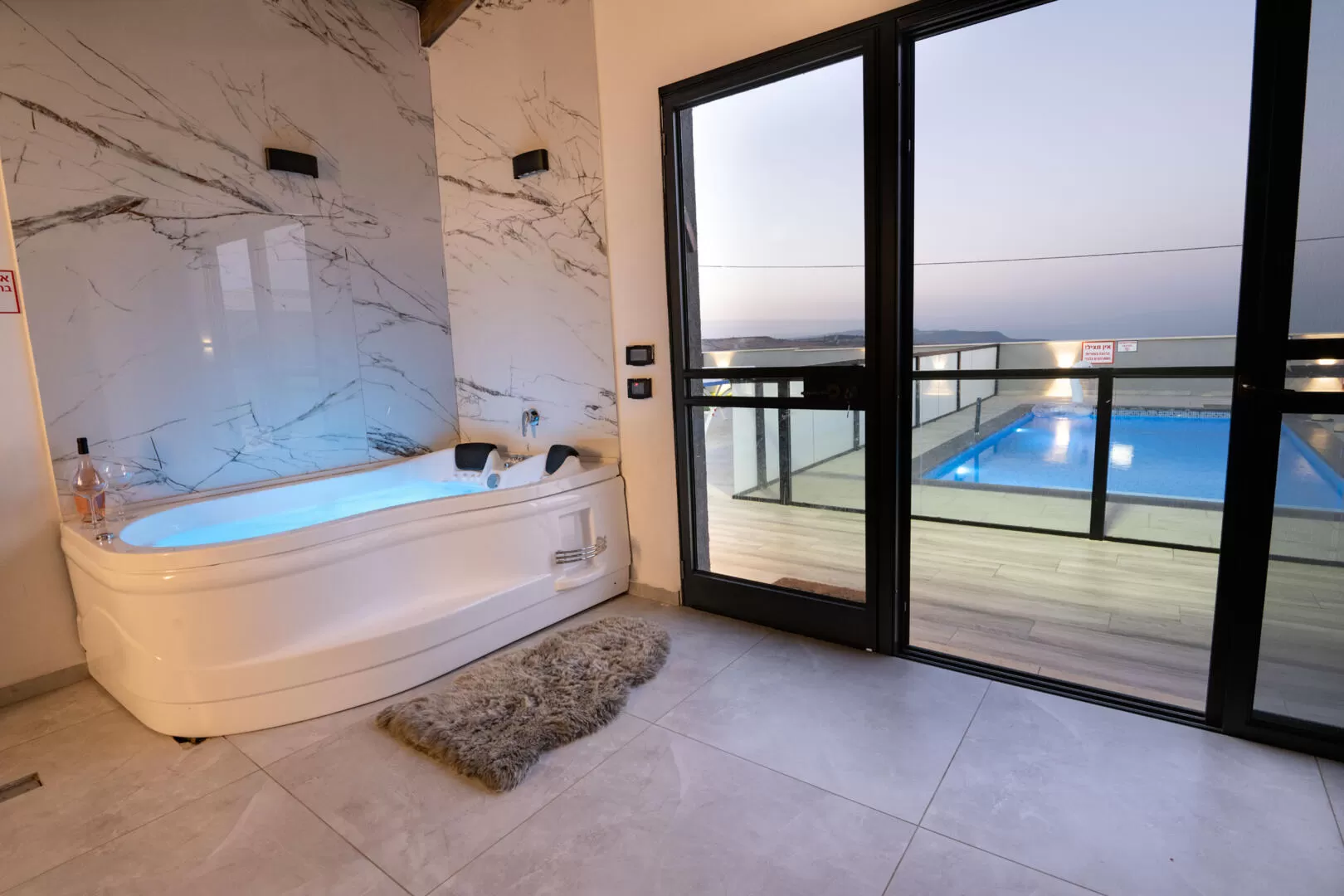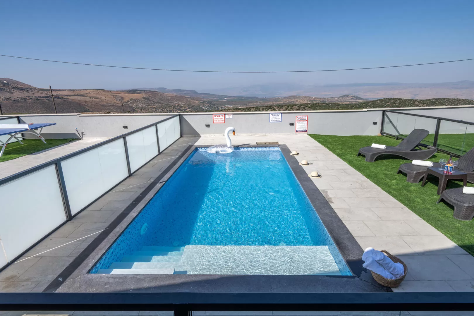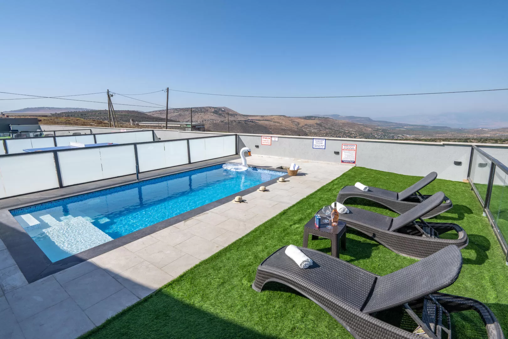The outdoor complex of the suites includes a large private pool for each suite fenced with a transparent and safety fence for children, and overlooks the open landscape. There is a sitting area and a private barbecue station for each unit. Beautiful lighting in the evening illuminates the complex and the pool, allowing immersion at any hour.