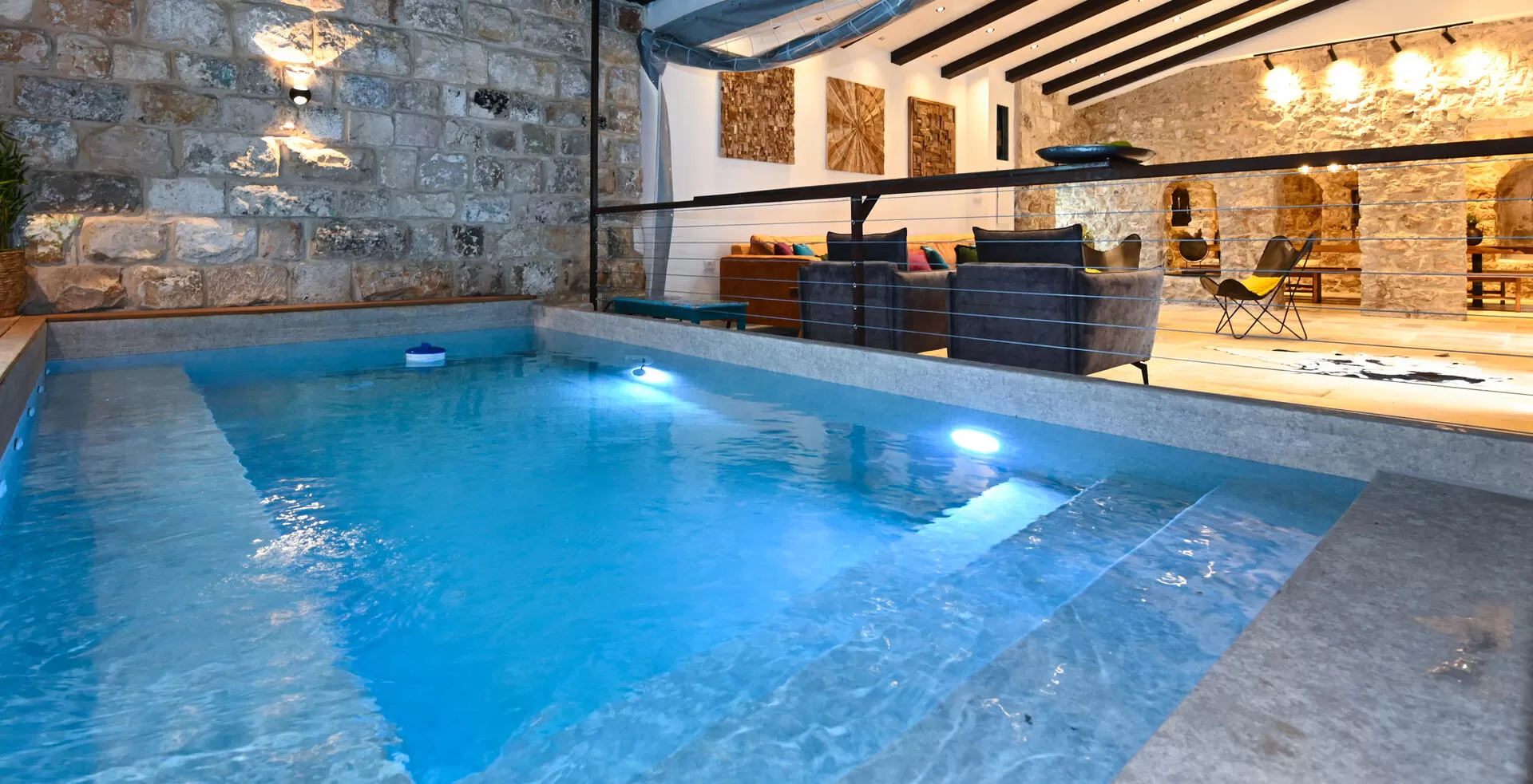 The building also contains an elegant and inviting indoor pool, a luxurious seating area with a large sofa and a large screen, and a fully equipped kitchen for cooking with a long knight's table.