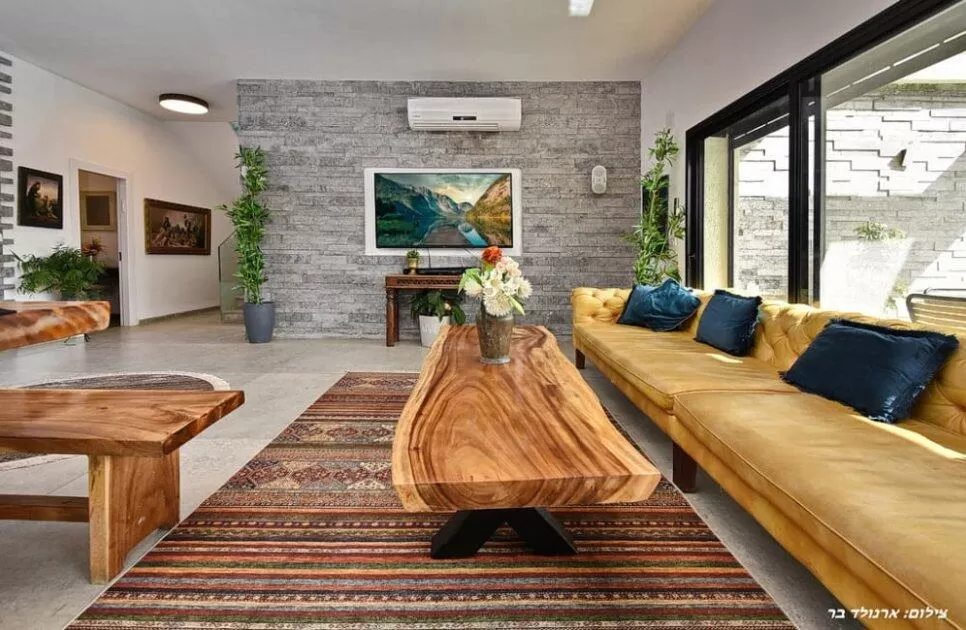 The living room is a delight to behold. The colors are chosen correctly and interesting materials are used in the interior design (did someone say a solid wood living room table?). The kitchen area is equally impressive, with an exceptionally large dining table, also in an unconventional design. Large windows let in lots of light into the space, and a huge sliding door creates a comfortable passage to the outdoors, where the real treat of a vacation awaits you.