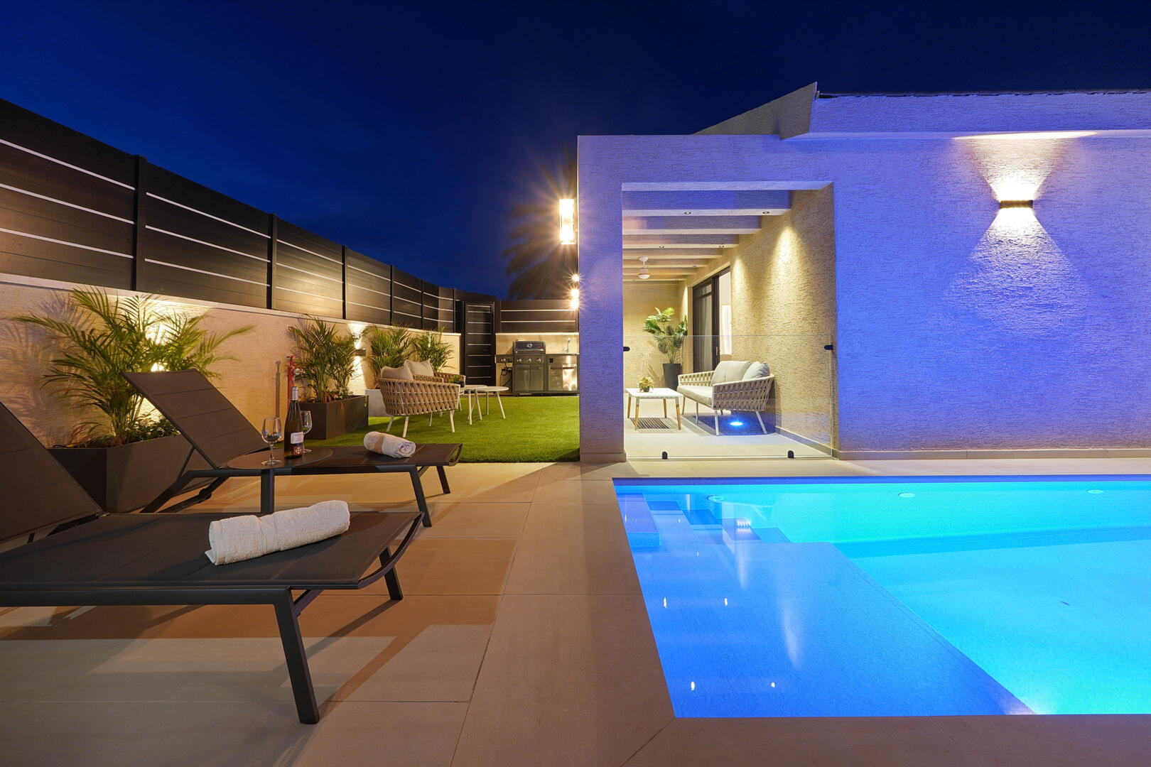 • Small Refrigerator Dining Room Sofa Heated Pool Gas Grill Outdoor Shower Covered Seating Area Covered Pool Seating Area Tanning Beds Lawn +5