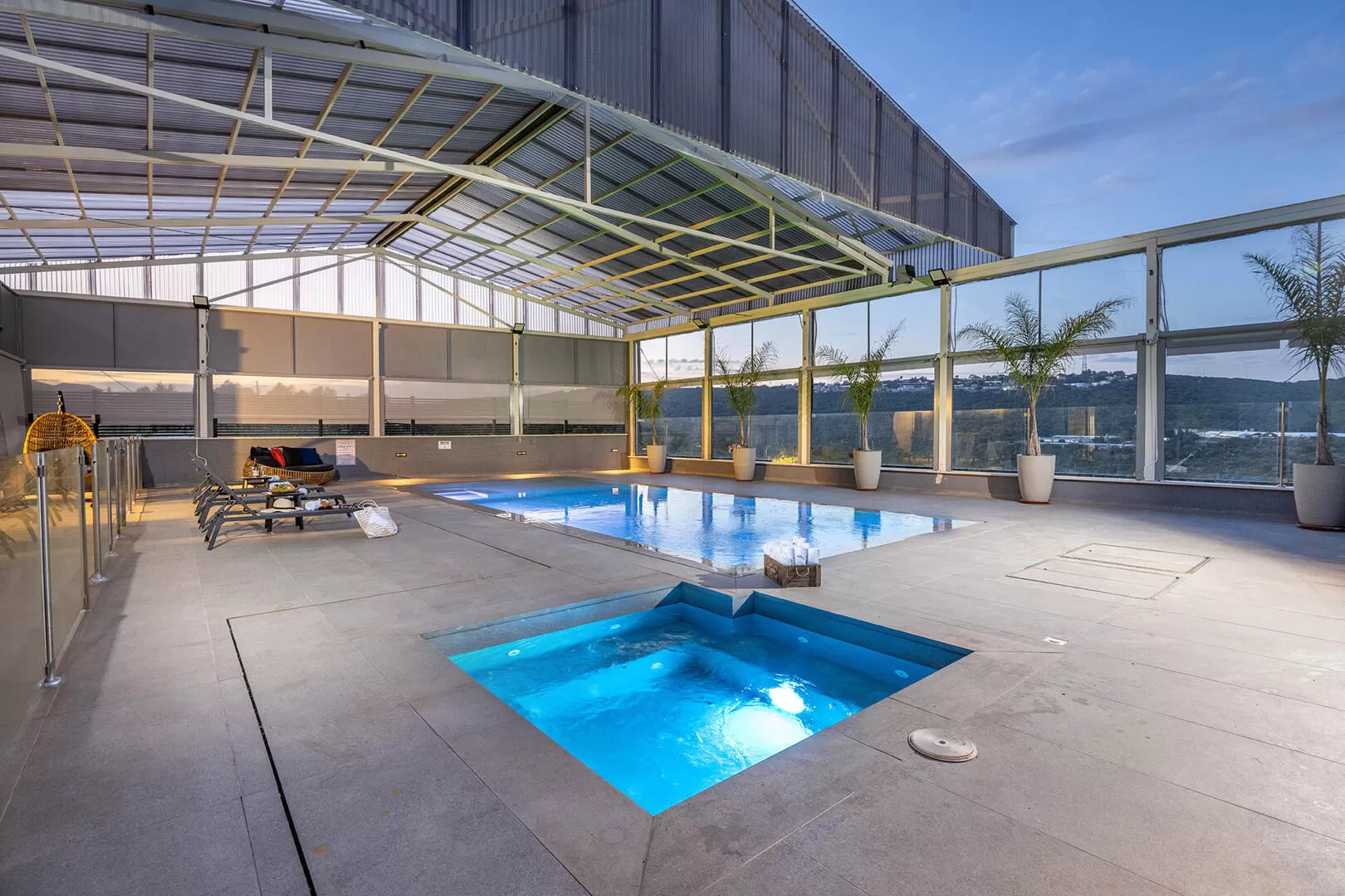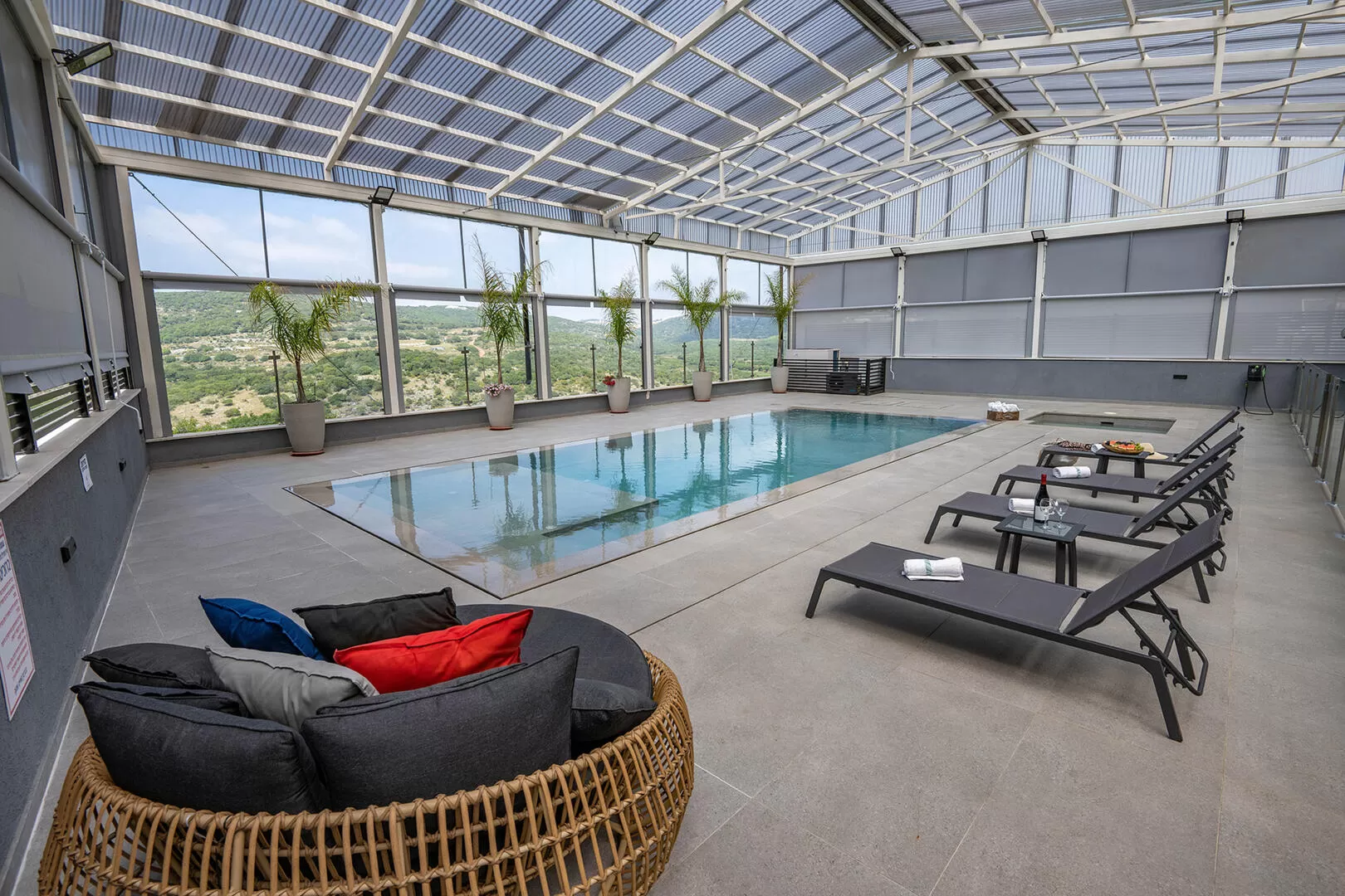 The spacious pool complex suitable for use in any season and any weather, the electric roof and curtains that open to the panoramic view, the variety of games for children of all ages.