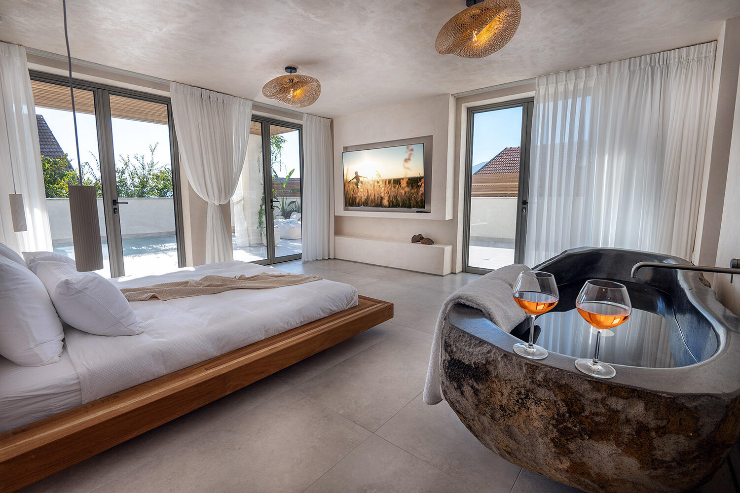 A black basalt bathtub, a huge display case that brings the blue pool inside, and mineral plaster on the walls that creates a warm and soft feeling – all of this was designed by Hadas, the host who is also an architect and interior designer. Nara Suites offers a couples' vacation that feels like a personal design project, full of elegance, aesthetics, and minimalism.