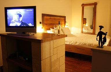 The units are built of stone, inside there are two thin levels of pine wood, separated by two steps. The upper level is used for sleeping and access to the mosaic encrusted bathroom and the lower one hosts a breakfast table, with leather upholstered chairs, a jacuzzi and a changing area. Part of the flooring is made of high-quality Mitzpe marble, while the bathroom has a delicate mosaic floor in light colors.