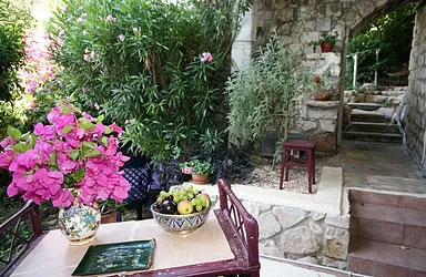 The path to the suite is paved with ancient stones. The path descends the mountainside, alongside the Rosh Pina Stream, which flows quietly most months of the year.