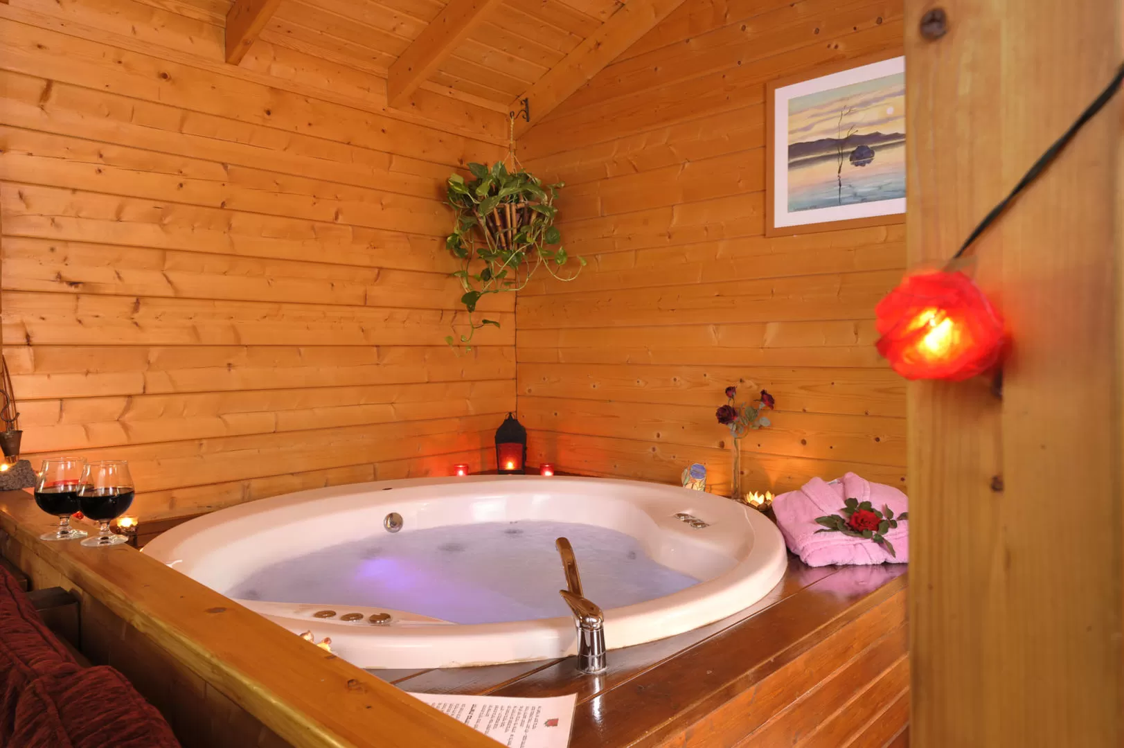 Outside the cabin there is a large area for privacy. An area for the spa, where there is a small pool, a jacuzzi from the movies, a sitting area and an outdoor bed for perfect relaxation.