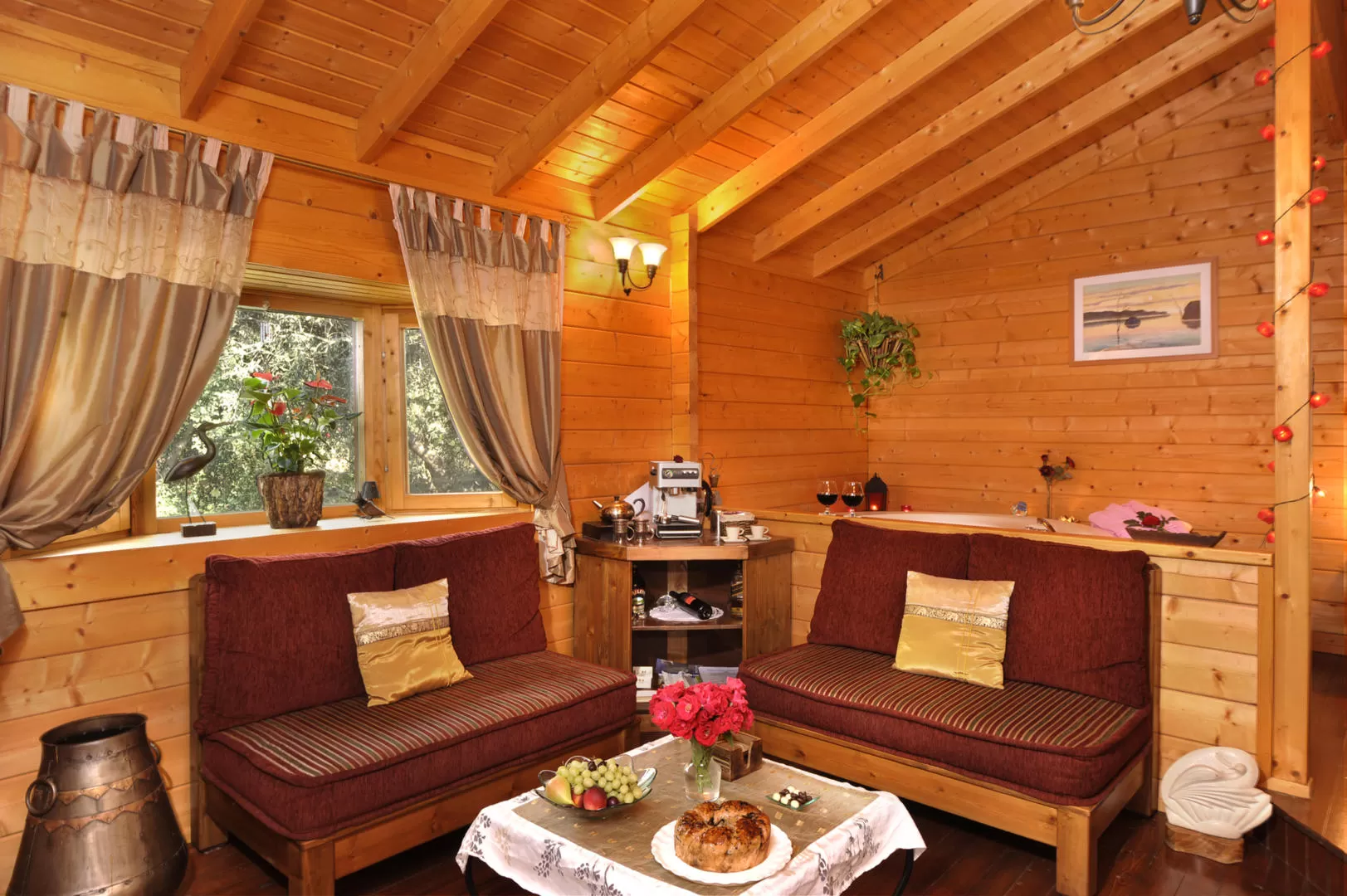 The complex is actually a huge olive vineyard and inside it were built in high privacy two pleasant wooden cabins with a private garden, a "thin" balcony overlooking the paths paved with basalt stones magically illuminated at night. Not far from the swinging hammock you will find a dry sauna complex. In the center of the common complex there is a nice round water pool used for wading and dipping and a spa jacuzzi.