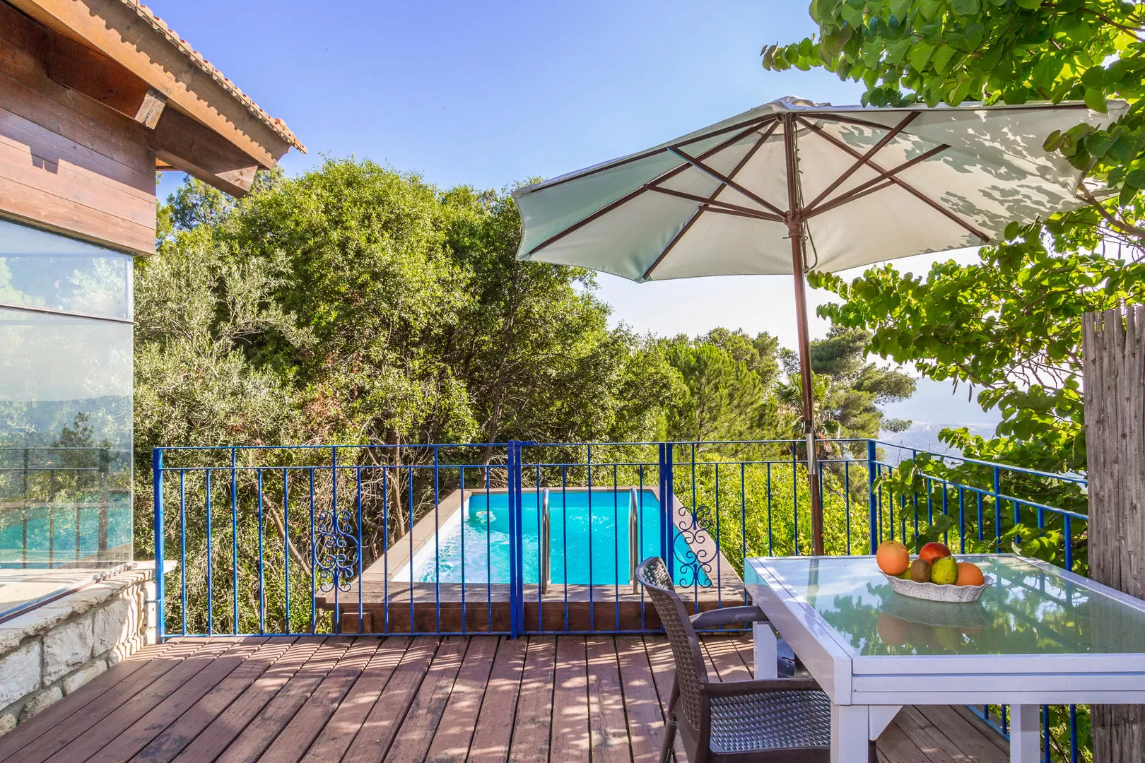 There is a pleasant and relaxed atmosphere here, created thanks to the high ceiling, built of thick wooden beams, rich vegetation and panoramic views, "peeking" into the suite through the large windows. The balcony faces a breathtaking view, and from the living room you can look out over the landscape and the pool.