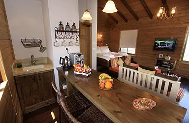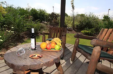 The southern cabin is designed in the same way but there are significant differences: the structure, made in the shape of a square, is different and conveys a feeling of freedom and space. This is the cabin for people who like an open and spacious space. And when you go outside - to the wooden balcony, sit on rough wooden armchairs around the table, sip delicious wine from the Golan Heights, indulge in the numerous refreshments, enjoy the smells and colors of the beautiful plants around - the world becomes simply perfect...