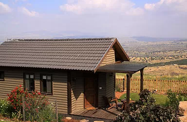 View: in the northern cabin - overlooking El Kedumim, a view of Mount Hermon and the northern Golan Mountains, a well-tended garden with intimate seating areas and a pastoral environment
