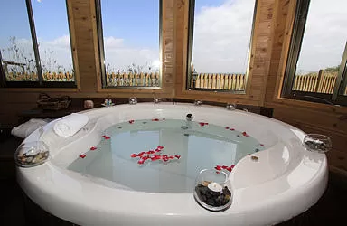 The cabin itself charmed me as much as its owner. In a rounded wooden structure, open to the view - there is nothing to do - just feel comfortable. The spacious space exudes intimacy and seems to invite the guest couples to curl up together on the low benches between soft and pleasant ethnic pillows, to relax in the round jacuzzi, surrounded by the windows overlooking a panoramic view and lit by candles scattered around... to hug on the luxurious bed, dressed in black and white.